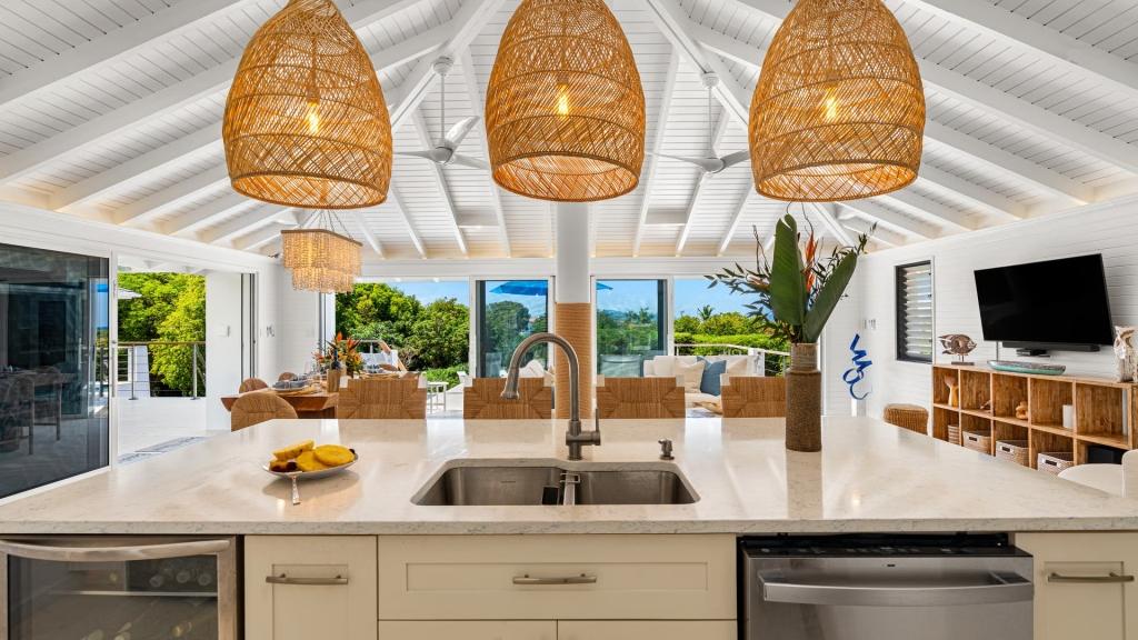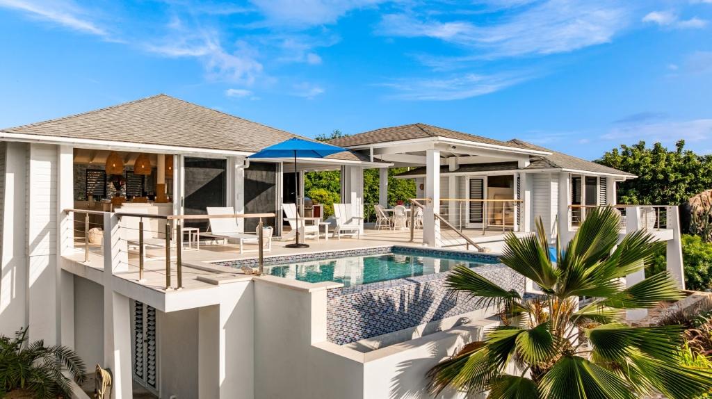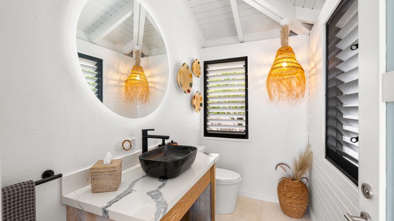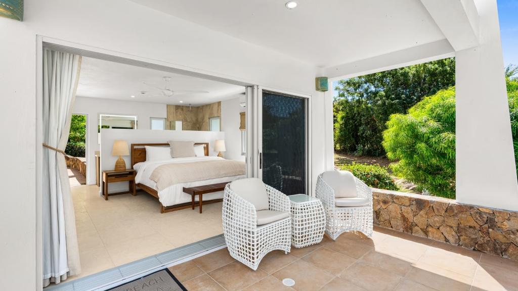 In keeping with its original integrity, this fully renovated classic Tahitian-style villa boasts two stories of imported coral stone floors, 3 elegant ensuite bedrooms with spacious walk-in showers, teak vanities, a gourmet kitchen, an infinity pool & private balconies throughout. These are centred around an architecturally designed circular staircase surrounded by exotic palm trees & beautiful landscaping. A private driveway and a palm-treed lined walkway lead you to the main entry of this beautiful villa. The main level opens onto a spacious covered veranda which leads to either the Great Room, Master Bedroom, or Infinity Pool. This spacious veranda holds a custom-built barbeque area, a stylish daybed, outdoor dining table & chairs & is a perfect space for outdoor dining & entertaining.