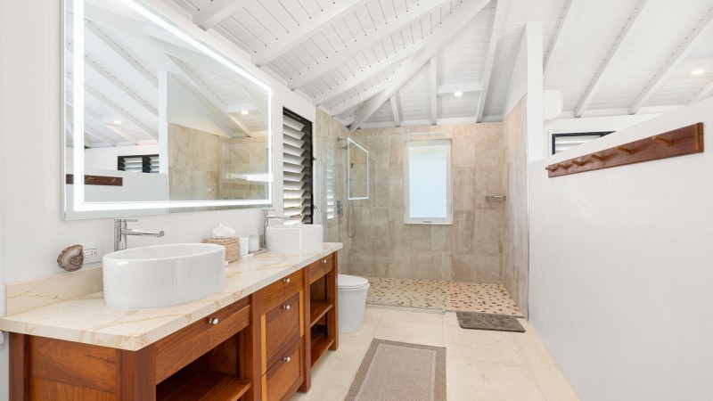 Master Bedroom STARS - Located on the upper level adjacent to the Great Room, this spacious Master Bedroom features a peaked ceiling of exposed beams, a king size bed, a large beautifully tiled walk-in shower, a double teak vanity, air conditioning, ceiling fan, a safe and sliding doors leading to a balcony where privacy and the nighttime universe is yours.