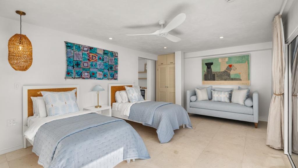 Bedroom 3 MOON - Located adjacent to Sun Kissed suite this spacious room features 2 twin-sized beds and a day bed. This suite is capable of accommodating 3 people. A walk-in shower, mini-frig, safe, and coffee-station add Moon Suite. Wall-to-wall sliding doors lead to a private outdoor patio. A marvellous night for a moon dance with the stars above your eyes.