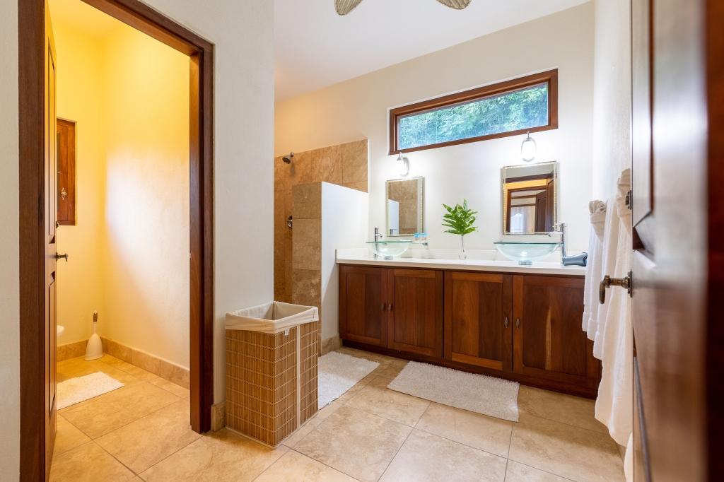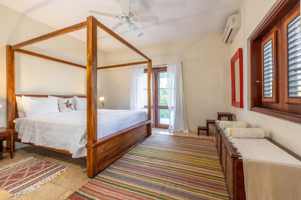 The two air-conditioned ground floor bedrooms provide comfortable Queen & King sized four poster beds with a single bed in the middle room for an additional guest. The main bathroom on the ground floor has double sinks & shower. The mezzanine floor bathroom has a stone clad outdoor shower, adding to the ambience of being in nature.