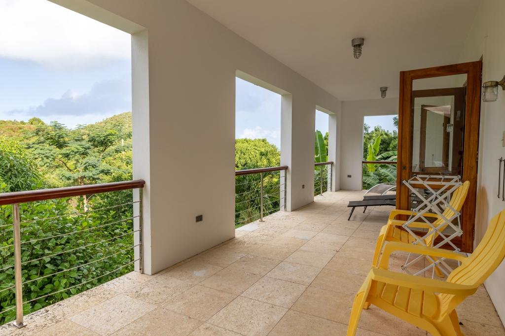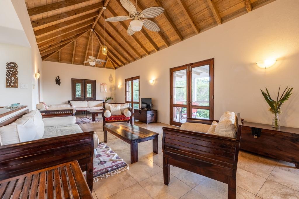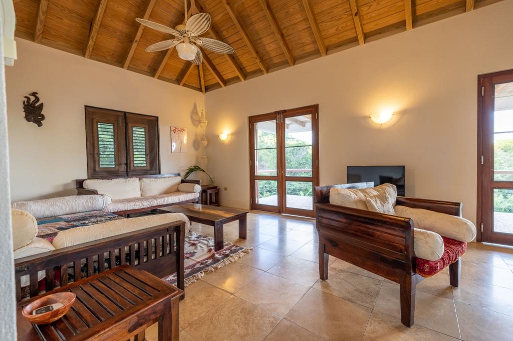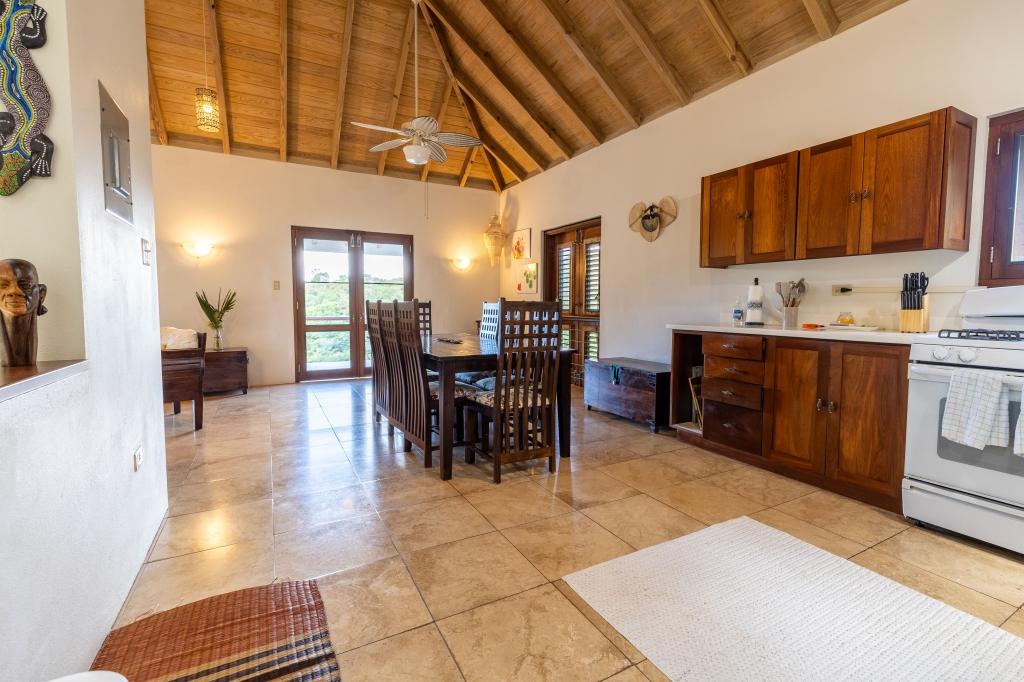 The spacious & elegant living room upstairs has generous seating with beautiful hand-made hardwood furniture. Dining table & chairs for 8, along with a well-equipped kitchen. There is ample cooling from the six ceiling & floor fans to enhance the cross-flow of the ocean breeze. The large verandas on both floors add to the sense of space & feature great views of the lush green hillsides. The sky over the lush Palm Grove and the blue ocean, the islands of Jost Van Dyke, Sandy Spit shimmer in the distance.