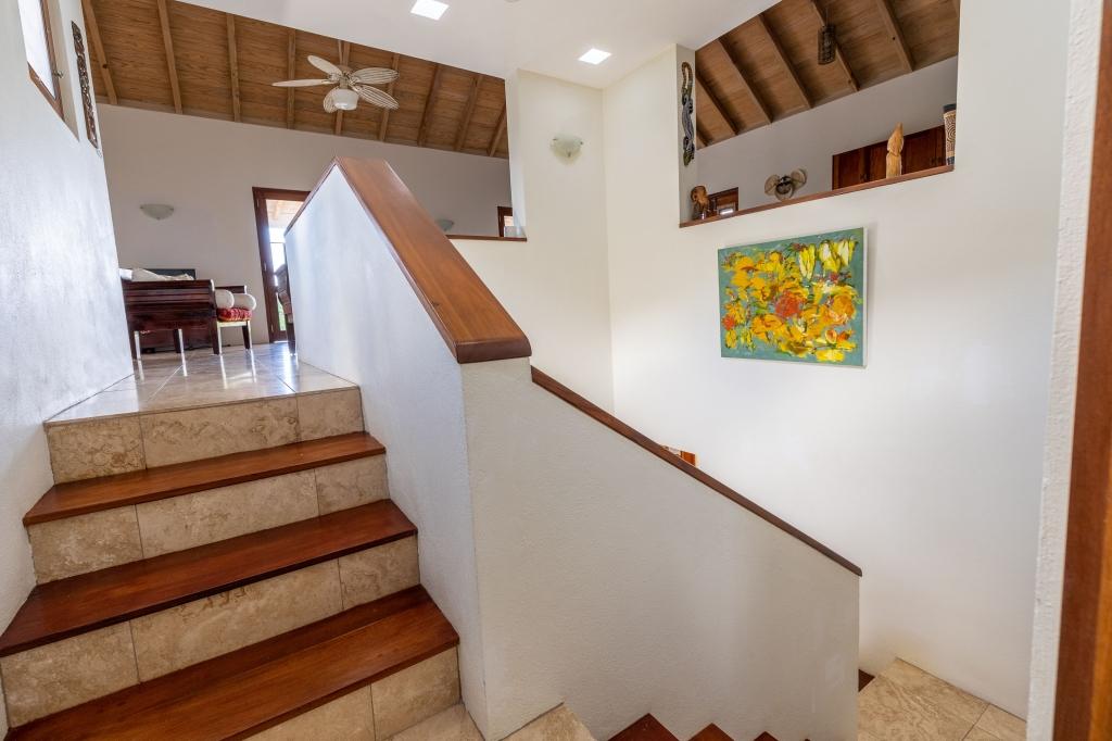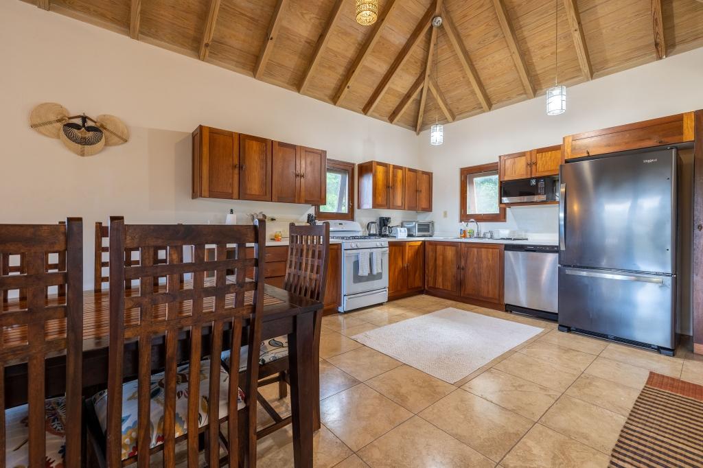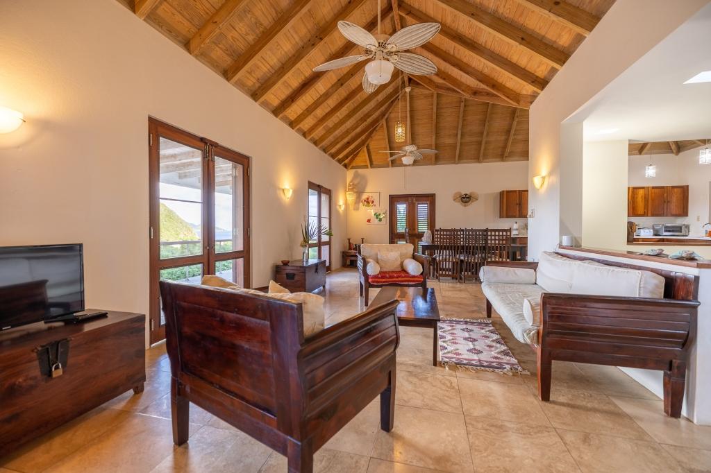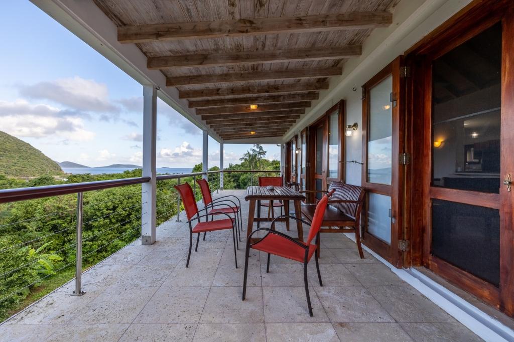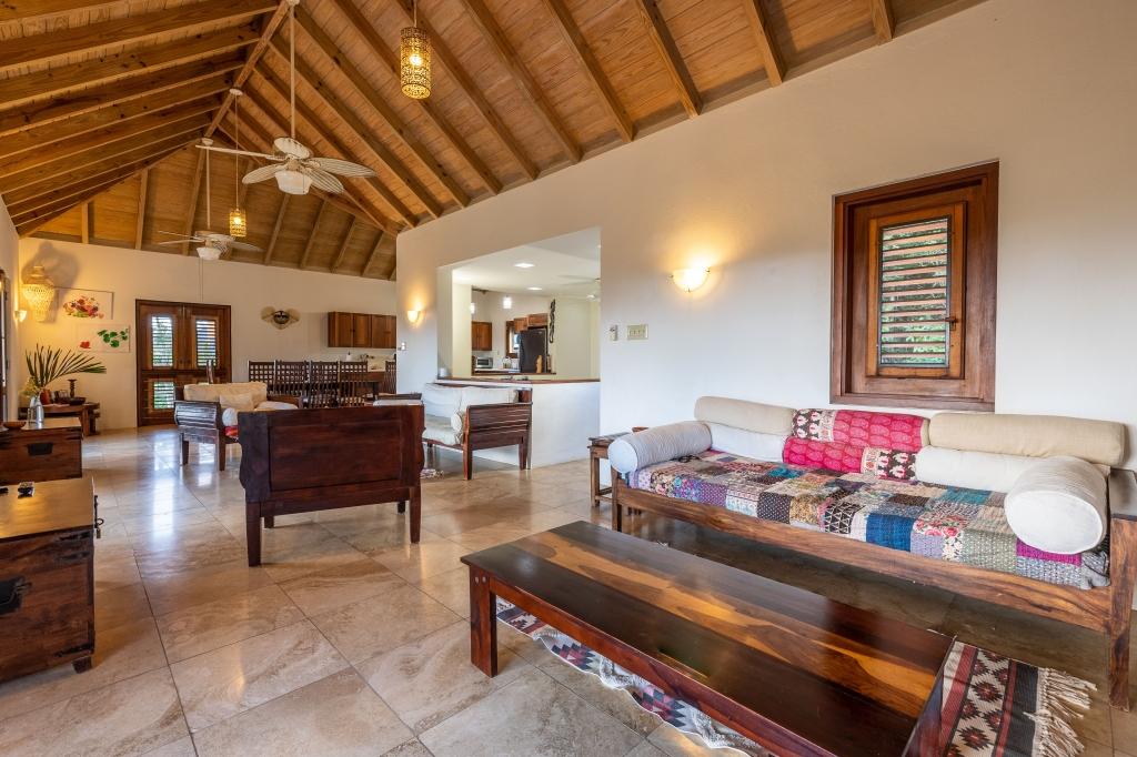 The spacious & elegant living room upstairs has generous seating with beautiful hand-made hardwood furniture. Dining table & chairs for 8, along with a well-equipped kitchen. There is ample cooling from the six ceiling & floor fans to enhance the cross-flow of the ocean breeze. The large verandas on both floors add to the sense of space & feature great views of the lush green hillsides. The sky over the lush Palm Grove and the blue ocean, the islands of Jost Van Dyke, Sandy Spit shimmer in the distance.