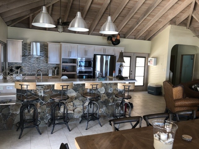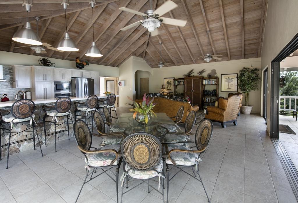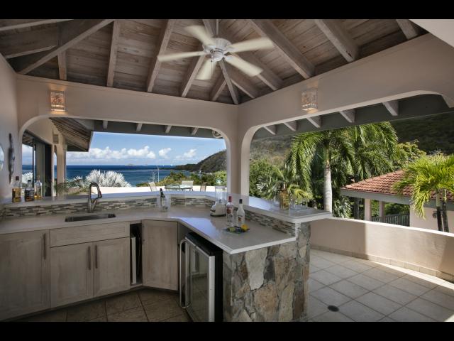 The good thing also with Adagio is the access is really good from the main pavilion, there is a ramp to access this area. The pool has a large terrace, so you can sit back & enjoy the sun, read a book or do whatever takes your fancy. Another good thing about this property layout is, for families you have privacy for guests to enjoy some time on their own if they wish, the layout lends itself to this really well. The Great Room has a lovely vaulted ceiling, so gives you a feeling of lots of space inside, glass sliding doors lead off to verandas where you can have the indoor-outdoor experience. The best bit about Adagio has to be the panoramic views out over Mahoe Bay, simply stunning! Alfresco dining allows you to take family time outside & watch those wonderful sunsets here in the BVI. There is also dining inside if you prefer a more formal setting. The well-equipped kitchen allows you to have a home from home experience, so you can chat & cook with family or friends. Outside you also have a wet bar with refrigerator & ice-maker.