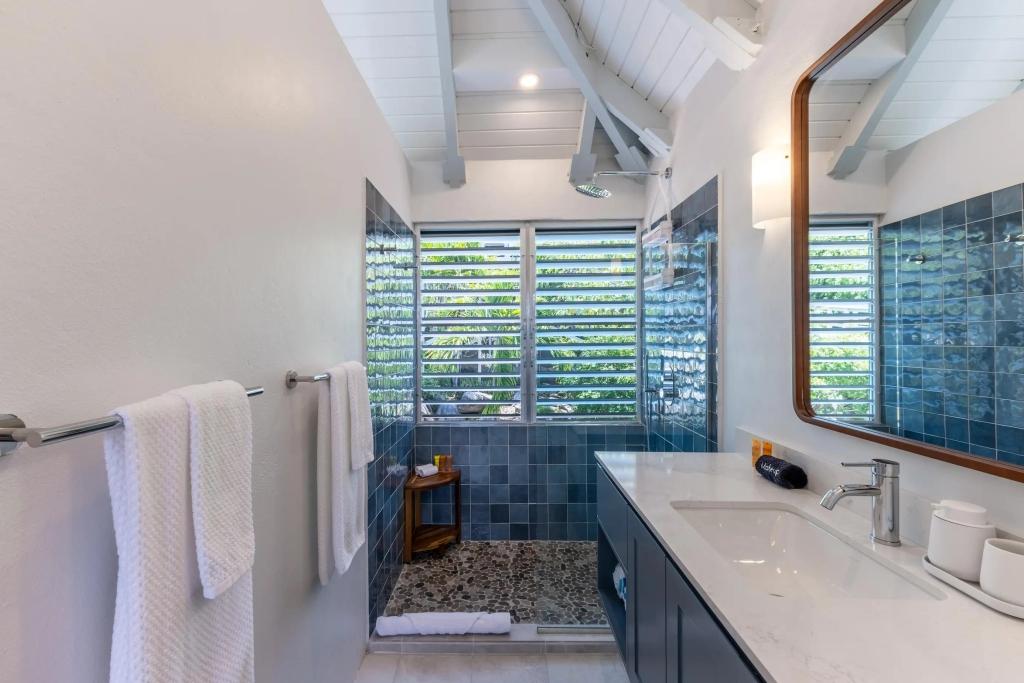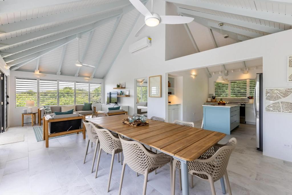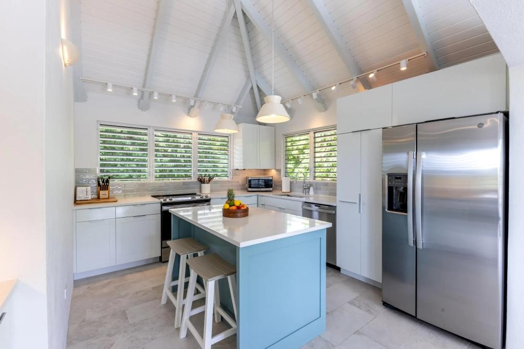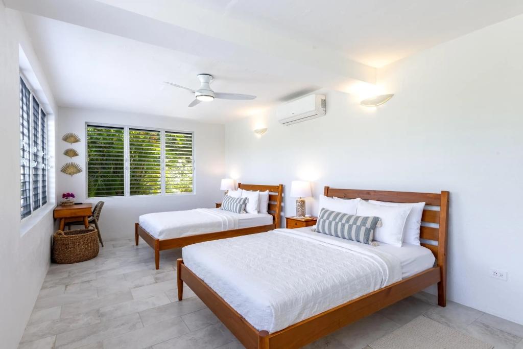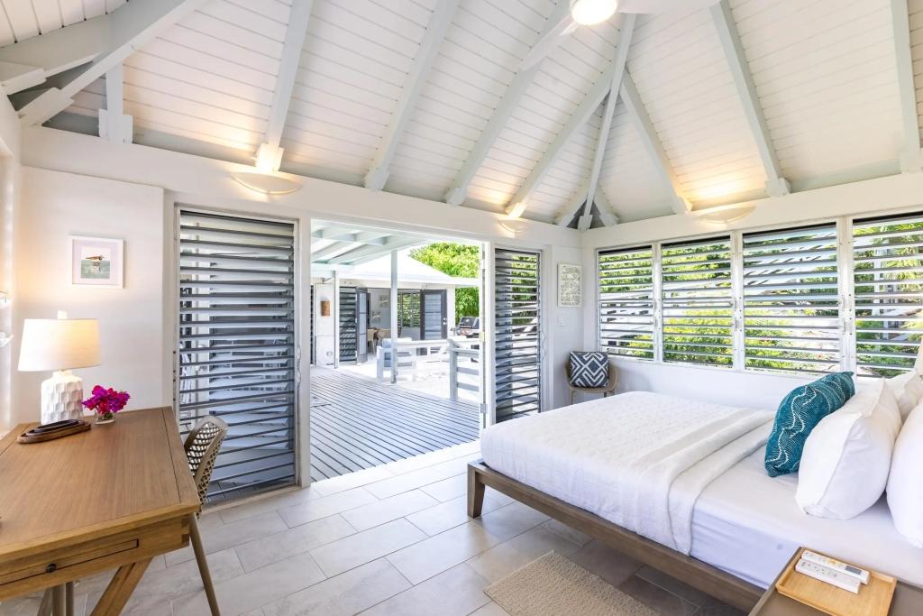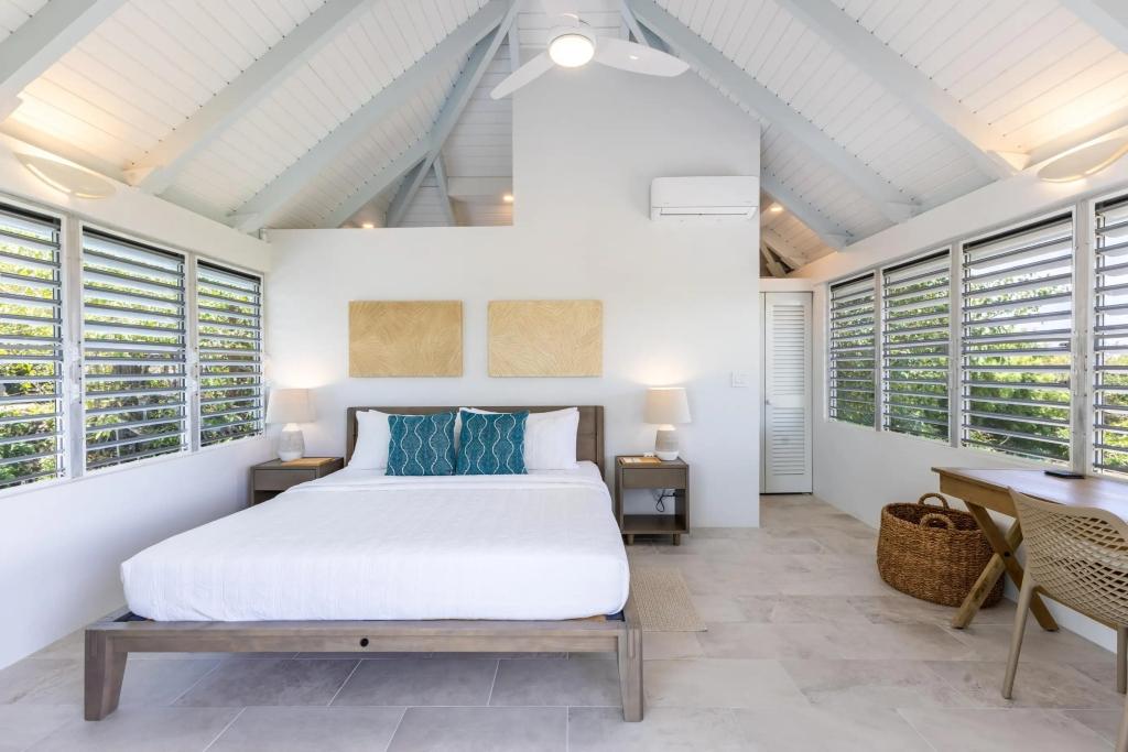Turnstone Villa is a modern refresh of a classic Caribbean beach house with louvered windows, tall ceilings & large open spaces cooled by island breezes. The villa can sleep up to 8 guests comfortably & is ideal for groups, families or a couple looking for a private getaway. The upper-level master suite is equipped with a king-size bed & overlooks the pool area and Sir Francis Drake Channel. The second queen bedroom is directly off the main living space on the upper level with views of the water and islands to the West. The third bedroom is on the lower level with 2 queen-sized beds & is perfect for kids. All of the bedrooms have en suite bathrooms.