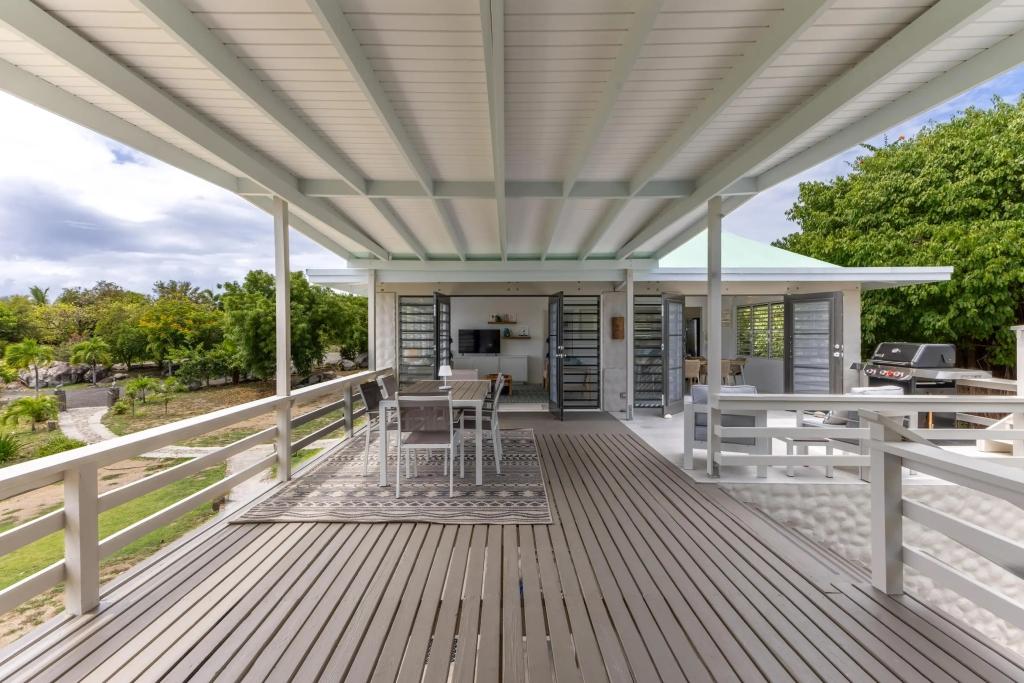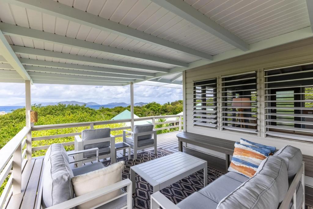 The upper living space, nicknamed “The Treehouse", this contains a second living room & second covered viewing deck. The best views of Little Trunk Bay are perfect from this spot. Why not browse the villa’s lending library, play a board game with the family, watch the sunset, or just simply stargaze!