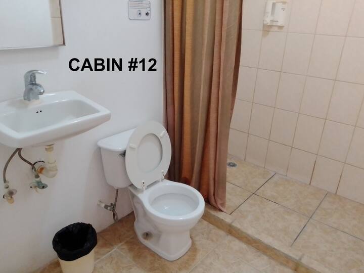 CABIN #12 is located on the second floor and though farthest from stairs its location is closer to the BBQ area (its location is further back from the main road so the noise is less). It only has a minimal hanging rack but it's our largest 2-bedroom unit with the first room having a full-size bed and a single bed, and the second room has 2 single beds for a max of 5 people. Each room has its own small TV. There's NO Kitchen or other furniture with a private bathroom toilet/shower. We have left a "Room Service" booklet that has different menus from local cuisine, that delivers FREE of charge or a small delivery fee, it also includes a Directory of local Emergency services like Clinic, Police, etc., and the front cover has Wi-Fi passwords.