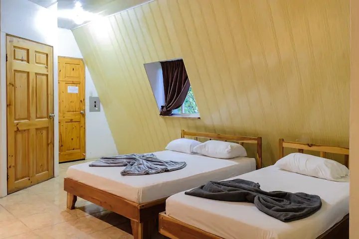 CABIN #11 is on the second floor and closest to stairs and the BBQ area (its location is further back from the main road so the noise is less). It only has a minimal hanging rack but it's our largest 2-bedroom unit with the first room having a full-size bed and a single bed, and the second room has 2 single beds for a max of 5 people. Each room has its own small TV. There's NO Kitchen or other furniture with a private bathroom toilet/shower. We have left a "Room Service" booklet that has different menus from local cuisine, that delivers FREE of charge or a small delivery fee, it also includes a Directory of local Emergency services like Clinic, Police, etc., and the front cover has Wi-Fi passwords.