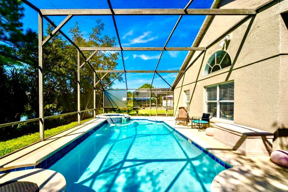 Ref 35. Stunning lake view villa with own pool/spa., Beautiful Villa rental in Four Corners has 4 bedrooms, 3 bathrooms, 8 sleeps, 1 minimum stay Villa for rent in Four Corners Florida with the amenities and near by attractions , Air Conditioning, Children Welcome, Deck/Patio, Free WiFi, Full Kitchen, Game Room, Heating, Linens Provided, No Pets Allowed, No Smoking, Parking, Private Pool, Swimming pool, Towels Provided, Washing Machine, Cable/Satellite TV, Dishwasher, Iron & Board , Microwave, Oven, Refrigerator, Stove, Telephone, Television, Washer/Dryer Dishware and Glassware, Heated Outdoor swimming pool, Wireless Broadband Internet, Kitchen stove, Washing machine and Essentials, Air conditioning and Heating available