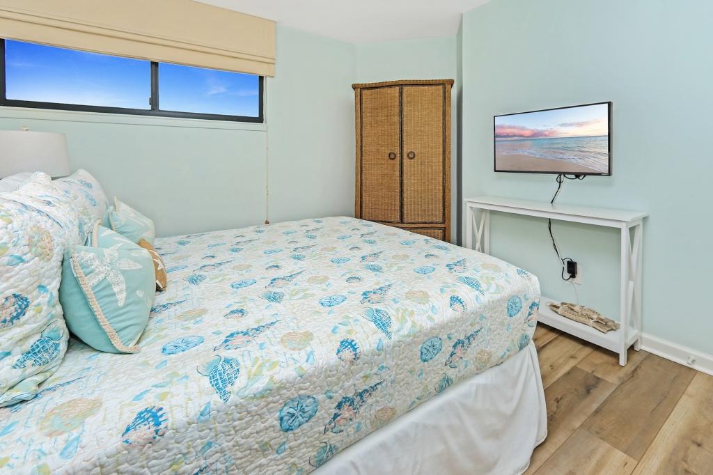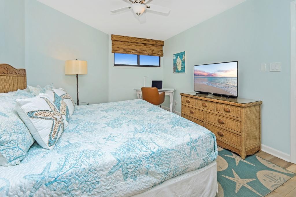 The large master bedroom suite has a wicker king bed, large HDTV (but you may never want to turn it on). There is a large master bathroom and lwalk in master closet. The second bedroom has a wicker queen bed , a wall-mounted TV, a wicker armoire and its own full bathroom with tub/shower. There are extra towels, pillows and blankets for your pleasure. A pull out sofa offers you extra sleeping for two and is brand new 2021.