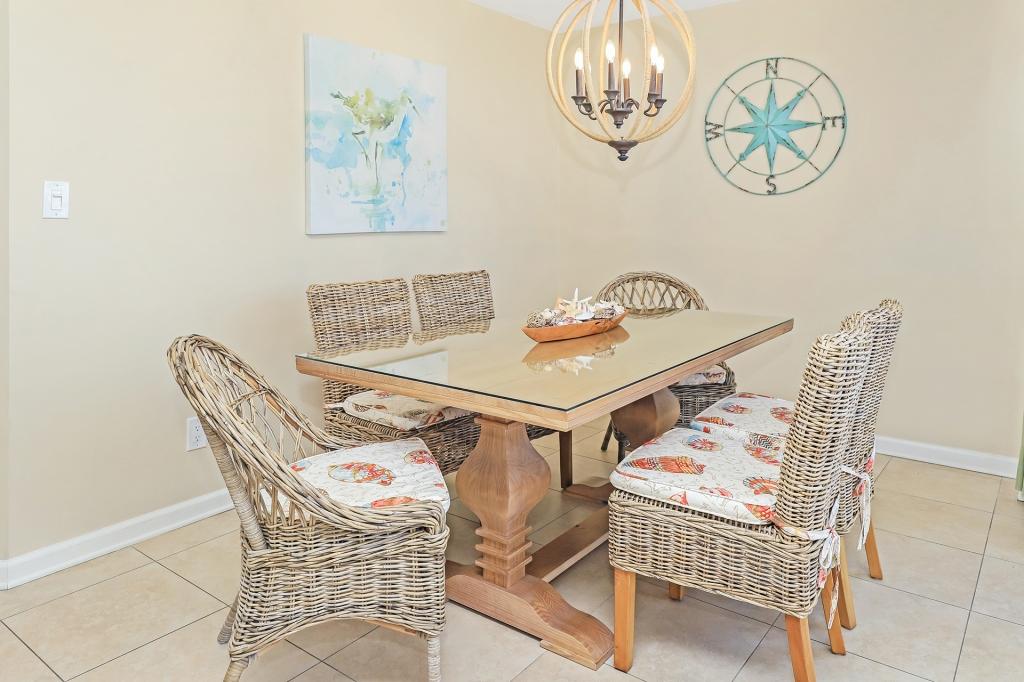 The brand new coastal pine pedestal table seats six witha custom glass top for your ease of use. The dining room table has 6 new Kabu wicker chairs with custom cushions in a seashell pattern complement the coastal decor.