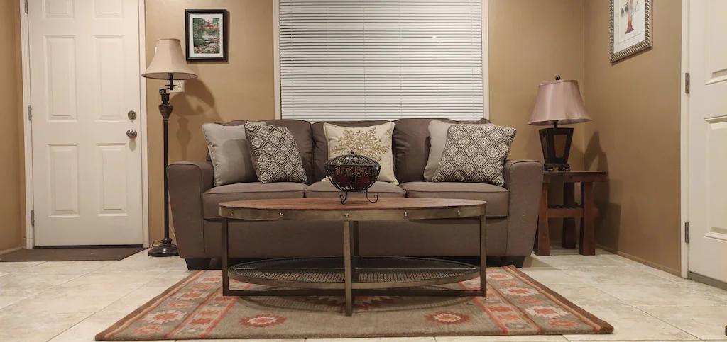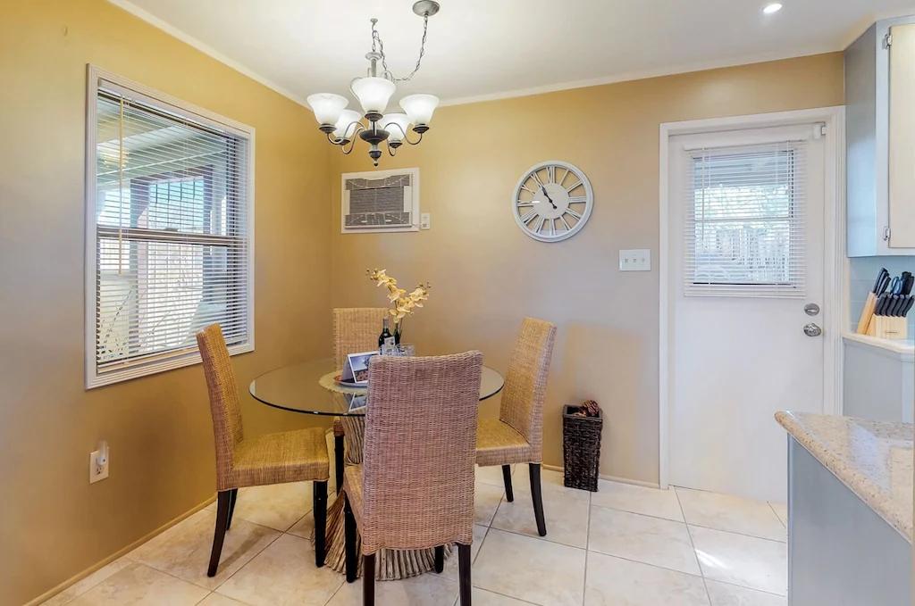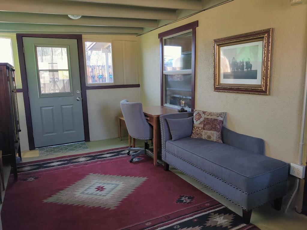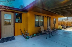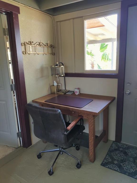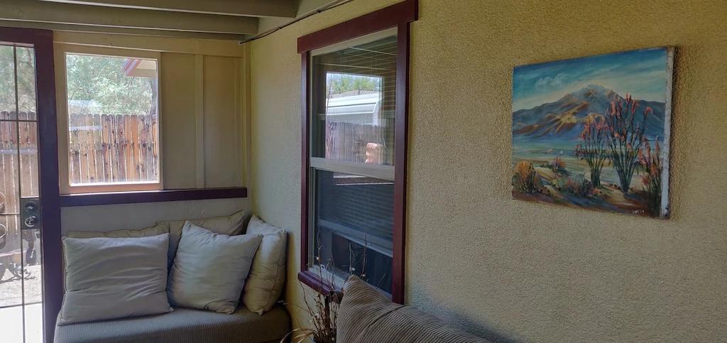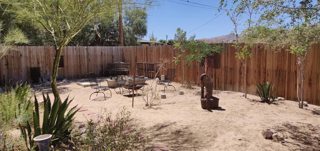 Joshua Tree Bungalow - Downtown (Mid-century), Beautiful Bungalow rental in Joshua Tree has 1 bedrooms, 1 bathrooms, 2 sleeps, 2 minimum stay Bungalow for rent in Joshua Tree California with the amenities and near by attractions , Air Conditioning, Deck/Patio, Fire extinguisher, Free WiFi, Heating, Kitchen, Parking, Towels Provided, Basic Soaps, Blender, Cable/Satellite TV, Ceiling Fans, Coffee Maker , Dishes & Utensils, Freezer, Hair Dryer , Hangers, Iron & Board , Microwave, Oven, Refrigerator, Shampoo, Stove, Toaster, Toilet Paper, Washer/Dryer Courtyard view, Desert view, Garden view, Cleaning products, Conditioner, Body soap, Hot water, Shower gel, Essentials-bed sheets, Bed linens, Extra pillows and blankets, Room-darkening shades, Drying rack for clothing, Clothing storage: closet, Record player, Sound system, Books and reading material, Board games, Portable fans, Smoke alarm, Carbon monoxide alarm, First aid kit, Dedicated workspace, Cooking basics-Pots and pans. oil. salt and pepper, Hot water kettle, Wine glasses, Baking sheet, Rice maker, Barbecue utensils, Coffee, Dining table, Private entrance, Laundromat nearby, Private backyard – Fully fenced, Fire pit, Outdoor furniture, Outdoor dining area, BBQ grill, Single level home, Self check-in, Lockbox
