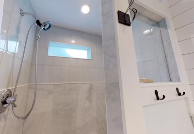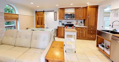You will be greeted by Lovely cool White Marble Floors throughout and popular White Washed Ship Lap walls. It centers on one Large Central Greatroom, Kitchen, Dining area. There is a Leather Queen Sleeper Sofa for extra sleeping and a convenient Half Bath. Plus a New Large Smart TV with Wifi.
