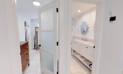 Gorgeous twin Spa Glass doors lead to the Master Bath and a large walk-in closet with room for Pack n Play available upon request. Everything in the Bath is shining Glass and Marble. Marble Vanity with Double Sinks. Marble walls & Floor. Glass Shower with Hand Held Shower Head. I want you to enjoy "pampering" yourself.