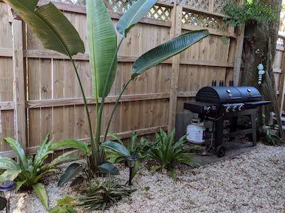 A frosted mural door off the Master leads to the Secret Garden. Private. Relaxing. There is a Covered Lanai with outdoor Table and Grill. Both Gas (provided) or Charcoal. Plus a Sofa and Chair.