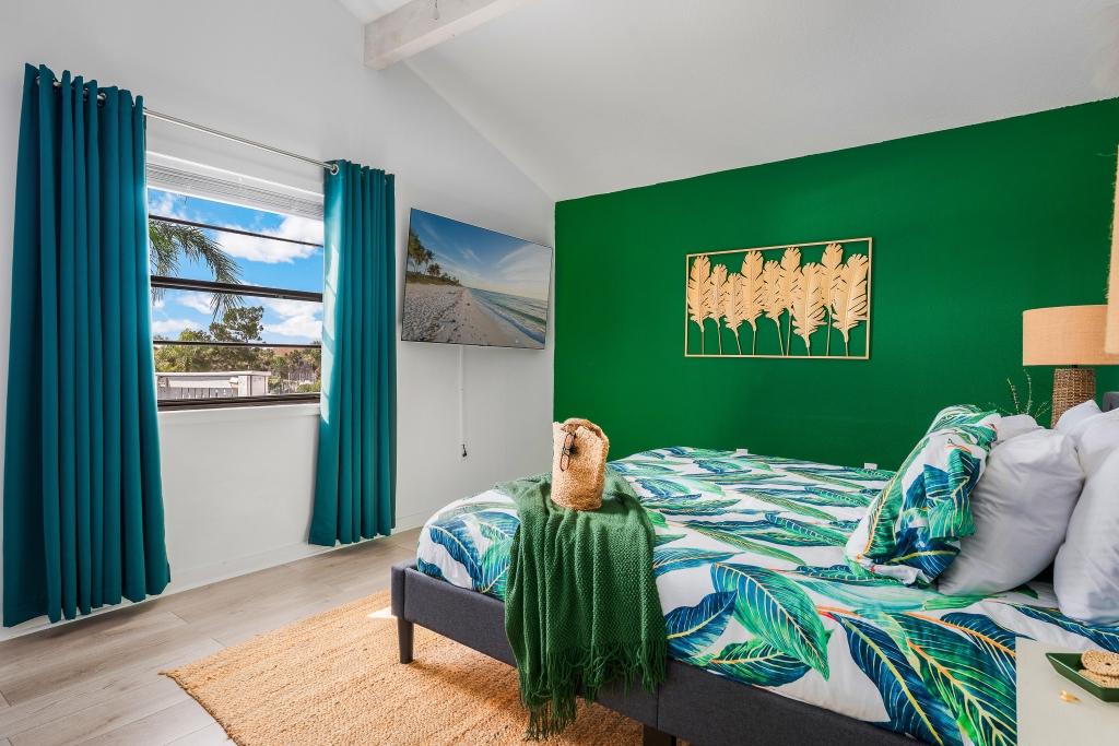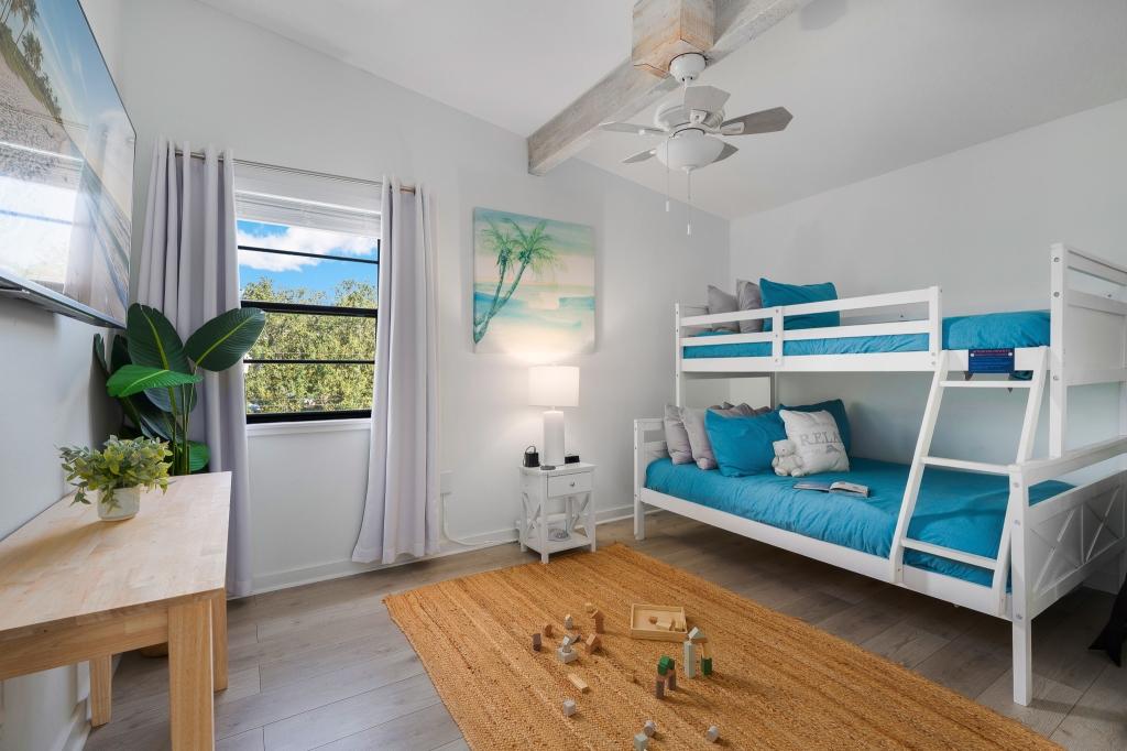 Accommodation - Primary Suite (3rd Floor): King-size bed, private balcony, and ensuite bathroom. - Bedroom #2 (3rd Floor): Comfortable queen-size bed. - Bedroom #3 (3rd Floor): Fun twin-over-full bunk bed. - Guest Bedroom #4 (2nd Floor): Cozy queen-size bed with an ensuite half bath.