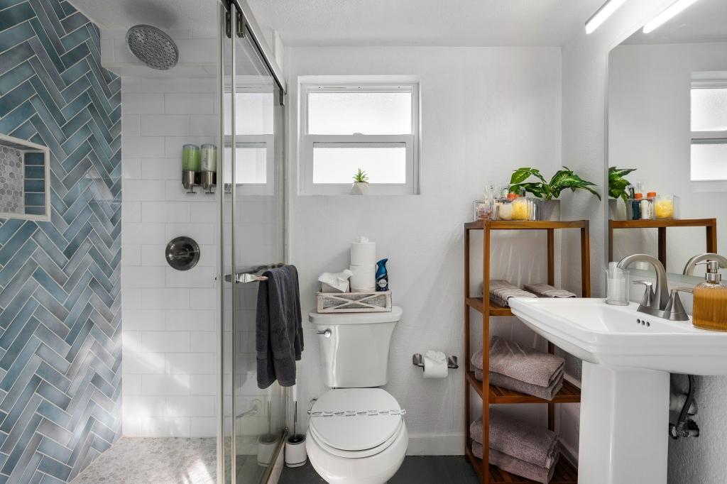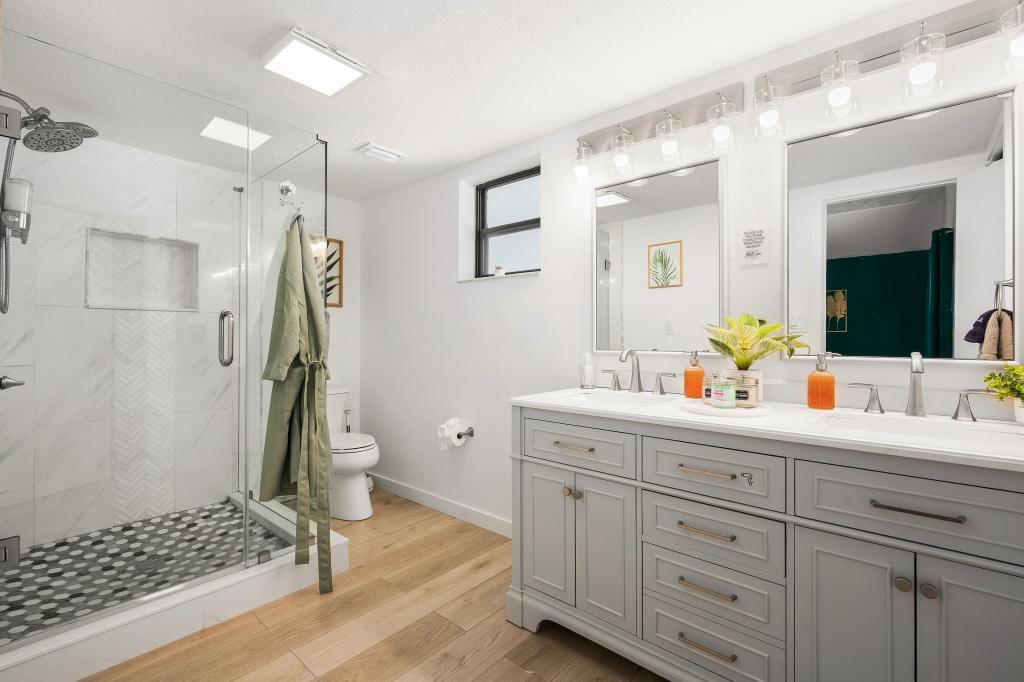 Bathrooms - Master Bathroom (3rd Floor): Features a modern standing shower. - Second Bathroom (3rd Floor): Combination shower and tub for relaxation. - Third Bathroom (2nd Floor): Convenient half bath in Bedroom #4. - Fourth Bathroom (2nd Floor): Additional half bath near dining area. - Fifth Bathroom (Ground Level): Shower conveniently located in the room by the pool area.