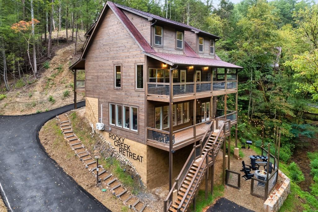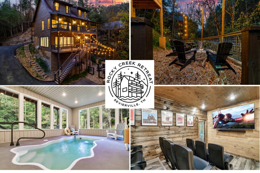 Rocky Creek Retreat, Beautiful Cabin rental in Sevierville has 4 bedrooms, 6 bathrooms, 12 sleeps, 1 minimum stay Cabin for rent in Sevierville Tennessee with the amenities and near by attractions , Air Conditioning, Balcony, Carbon monoxide detector, Children allowed, Children Welcome, Deck/Patio, Exterior lighting, Fire extinguisher, Fireplace, Free WiFi, Game Room, Heated Pool, Hot Tub, Indoor Pool, Internet, Kitchen, Linens Provided, Mountain View, No Pets Allowed, No Smoking, Paper Towels, Parking, Private Pool, Smoke detector, Towels Provided, Washing Machine, Wheelchair Accessible, Basic Soaps, Blender, Ceiling Fans, Clothes Dryer, Coffee Maker , Dishes & Utensils, Dishwasher, First-aid kit, Freezer, Hair Dryer , Hangers, Ice Maker, Iron & Board , Kettle, Living Room, Microwave, Outdoor Grill, Refrigerator, Shampoo, Stove, Television, Toaster, Toilet Paper, Antiquing, Bird watching, Boating, Cycling, Ecotourism, Golf, Hiking, Horseback riding, Hunting, Ice skating, Jet skiing, Kayaking, Mountain biking, Mountain climbing, Museums, Outlet shopping, Rafting, Rock climbing, Sailing, Shopping, Skiing, Sledding, Swimming, Theme parks, Water parks, Water skiing, Water sports, Water tubing, Wildlife viewing, Winery tours, Maximum occupancy: 12, Infants welcome, Minimum age of primary renter: 25, Pool View, River View, Central Heating, Lock On Bedroom Door, Body Soap, Clothing Storage (closet or wardrobe), Extra Pillows & Blankets, Hair Conditioner, Portable Fans, Hot Water, Laptop Friendly Workspace, Private Entrance, Free Internet, Shower Gel, Spices/Pantry Items, Dining Table , Coffee, Pots & Pans, Baking Sheet, Rice Maker, Kitchen Island, Barbeque/Grill Utensils, Wine Glasses, Child's Highchair, Seating for 13 people, Games/Board Games, Smart TV, Video Games, Toys, Stereo , Baby Gate, Room Darkening Shades, Children's Dinnerware, Pack N Play/Travel Crib, Private Yard, Outdoor Seating , Fire Pit, Hammock , Outdoor Dining, Free Parking On Premises, Free Parking, EV Charger, Adventure, Family, Freshwater Fishing, Mountaineering, Whitewater Rafting, Pier Fishing, Wind Surfing, Linens High Temp Wash, Deadbolt Lock, Fire Emergency Contact , Medical Emergency Contact, Emergency Exit Route , Police Emergency Contact, Enhanced Cleaning Practices, Cleaning Disinfection, Common Surface Disinfectant Cleaned, Requires Stairs, Near Lake- River- or Water Body, Cameras/Surveillance , Pool/Jacuzzi With No Fence, Path To Entrance Lit At Night