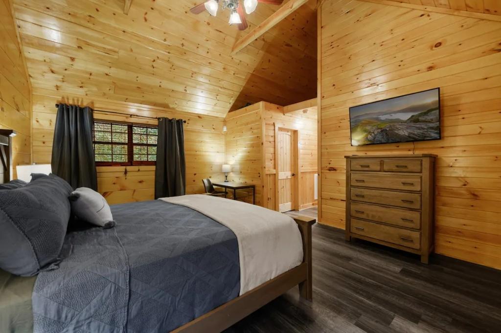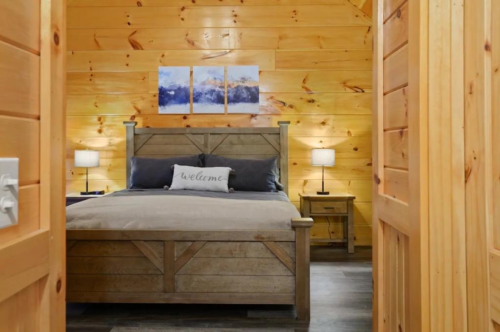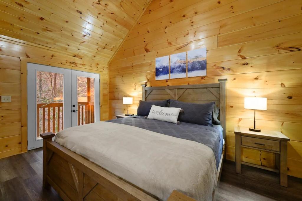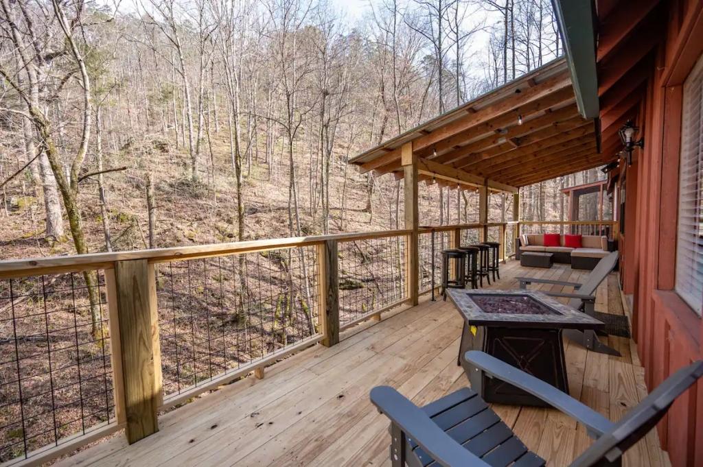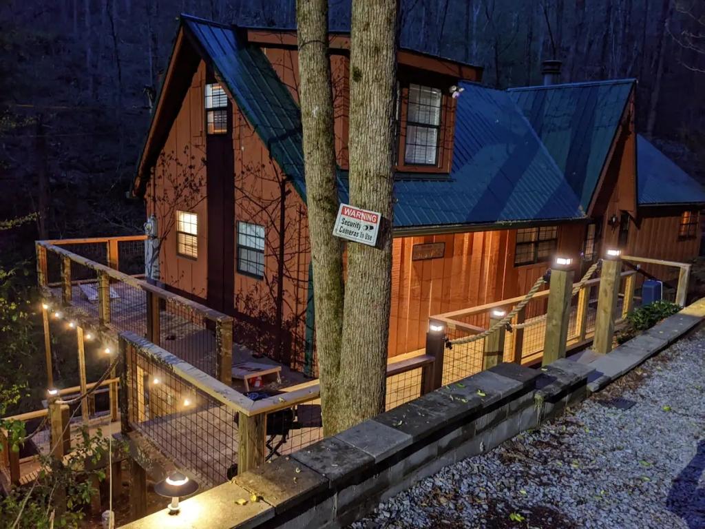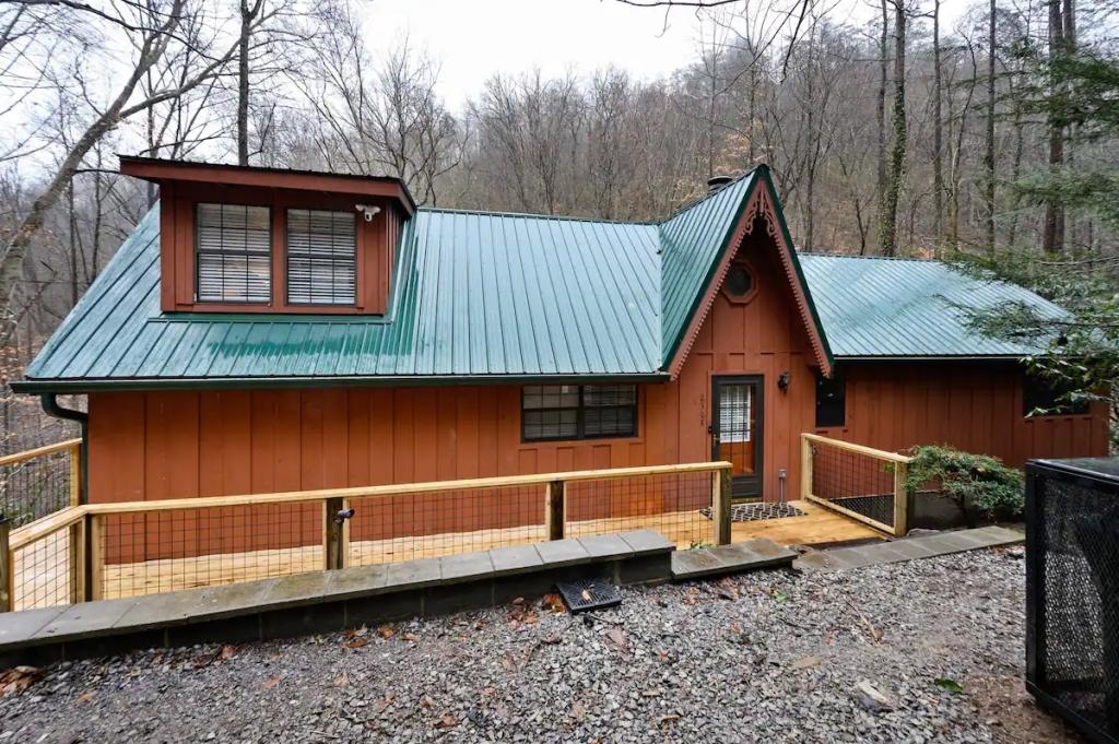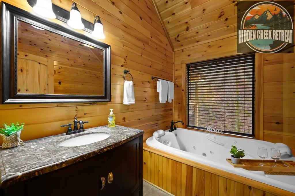 Couples Escape, hot tub, private creek close to attractions, Beautiful Cabin rental in Sevierville has 2 bedrooms, 2 bathrooms, 6 sleeps, 2 minimum stay Cabin for rent in Sevierville Tennessee with the amenities and near by attractions , Air Conditioning, Balcony, Deck/Patio, Fireplace, Free WiFi, Heating, Hot Tub, Linens Provided, Parking, Towels Provided, Waterfront, Kitchen, Fire extinguisher, Children allowed, Smoke detector, Carbon monoxide detector, Microwave, Outdoor Grill, Ceiling Fans, Oven, Toaster, Coffee Maker , Hair Dryer , Refrigerator, Dishes & Utensils, Dishwasher, Dining Area, Toilet Paper, Shampoo, Hangers, Swimming, Outlet shopping, Winery tours, Fishing, Theme parks, Bird watching, Ecotourism, Museums, Water parks, Health/beauty spa, Zoo, Horseback riding, Antiquing, Shopping, Sledding, Wildlife viewing, Cycling, Golf, Hiking, Kayaking, Mountain biking, Mountain climbing, Rafting, Rock climbing, Ski lift privileges, Snowboarding, Water tubing, Hospital, fitness centerRiver view, Conditioner, Body soap, Hot water, Free washer – In unit, Free dryer – In unit, Extra pillows and blankets, Room-darkening blinds, Clothes storage: wardrobe and chest of drawers, 65" HDTV, Board games, Central air conditioning, Indoor fireplace, Portable fans, Security cameras on property, Dedicated workspace, Cooking basics, Pots and pans, salt and pepper, Stainless steel electric cooker, Wine glasses, Baking sheet, Barbecue utensils, Coffee, Private entrance, Private back garden – Not fully fenced, Firepit, Outdoor furniture, BBQ grill, Self check-in, Smart lock