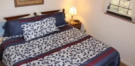 Two bedrooms, Queen-size bed, Two Twin beds, Queen-size sleeper sofa, One and a half bath, Wood Stove with glass doors, Living Room