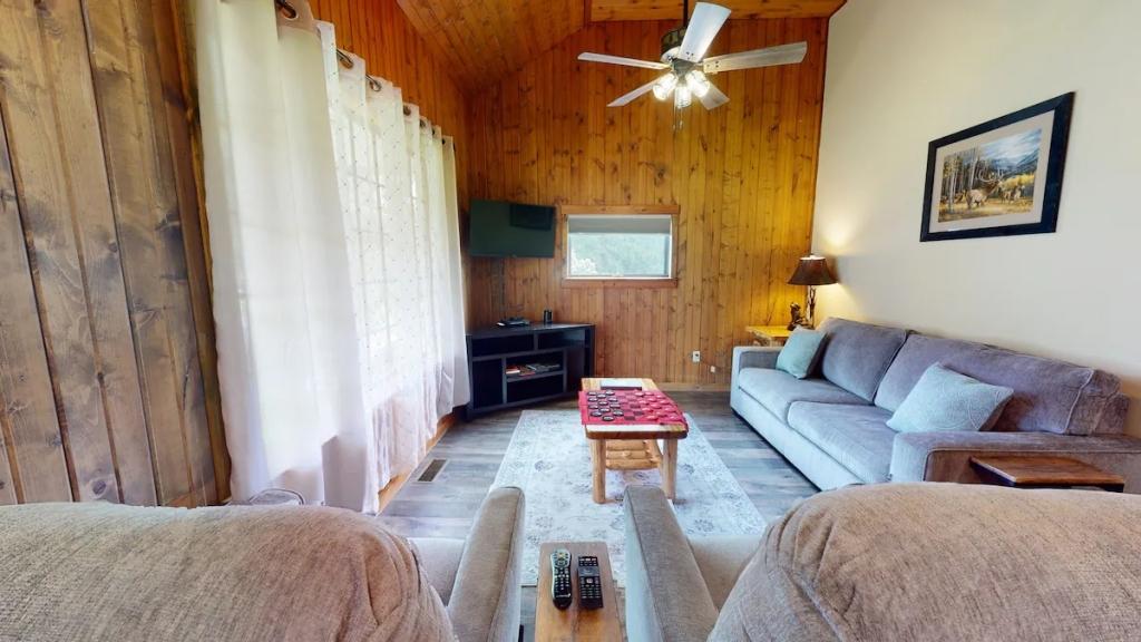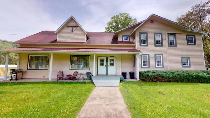 Escape to Pine Creek & PA Grand Canyon at, Beautiful Cabin rental in Gaines has 2 bedrooms, 1 bathrooms, 4 sleeps, 1 minimum stay Cabin for rent in Gaines Pennsylvania with the amenities and near by attractions , Air Conditioning, Balcony, Deck/Patio, Fire extinguisher, Heating, Kitchen, Linens Provided, Mountain View, Pet Friendly, Towels Provided, Basic Soaps, Cable/Satellite TV, Coffee Maker , Dishwasher, Freezer, Hair Dryer , Hangers, Iron & Board , Kettle, Microwave, Oven, Toaster, Toilet Paper, Washer/Dryer Cleaning products, Hot water, Paid washer – In building, Paid dryer – In building, bed sheets, Bed linen, Extra pillows and blankets, Room-darkening blinds, Clothes storage: wardrobe, TV with standard cable/satellite, Life-size games, Travel cot, Children’s books and toys, High chair, Children’s tableware, Board games, Outdoor playground, Central air conditioning, Indoor fireplace, Ceiling fan, Portable fans, Exterior security cameras on property, Smoke alarm, Carbon monoxide alarm, First aid kit, Wifi, Dedicated workspace, Pocket wifi, Fridge, Cooking basics, Dishes and cutlery, Mini fridge, GE electric cooker, Wine glasses, Baking sheet, Barbecue utensils, Dining table, Coffee, Shared beach access, Private entrance, Launderette nearby, Resort access, Private patio or balcony, Private back garden – Not fully fenced, Firepit, Outdoor furniture, Outdoor dining area, BBQ grill, Free parking on premises, Single level home, Pets allowed, Luggage drop-off allowed, Long-term stays allowed, Self check-in, Keypad, Cleaning available during stay