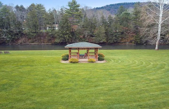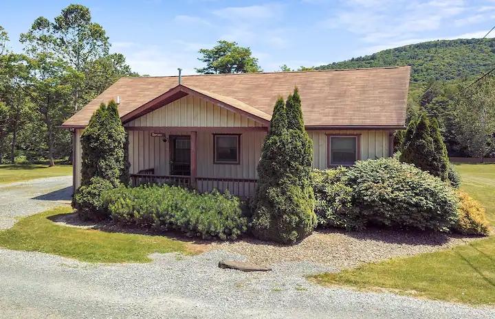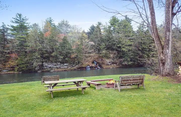 Spruce Cabin with Hot Tub &Fire Pit, Beautiful Cabin rental in Gaines has 2 bedrooms, 2 bathrooms, 7 sleeps, 1 minimum stay Cabin for rent in Gaines Pennsylvania with the amenities and near by attractions , Balcony, Carbon monoxide detector, Deck/Patio, Fire extinguisher, Free WiFi, Heating, Hot Tub, Kitchen, Mountain View, Pet Friendly, Smoke detector, Waterfront, Cable/Satellite TV, Coffee Maker , First-aid kit, Hair Dryer , Iron & Board , Microwave, Oven, Television, Washer/Dryer River view, Hot water, Paid washer – In building, Paid dryer – In building, Bed linen, Extra pillows and blankets, TV with standard cable/satellite, Cot, Travel cot, Children’s books and toys, High chair, Board games, Outdoor playground, Window AC unit, Indoor fireplace: gas, Exterior security cameras on property, Dedicated workspace, Fridge, Cooking basics, Dishes and cutlery, GE gas cooker, Private entrance, Resort access, Private patio or balcony, Shared back garden – Not fully fenced, Firepit, Outdoor furniture, Outdoor dining area, BBQ grill, Free parking on premises, Pets allowed, Self check-in, Keypad, Cleaning available during stay