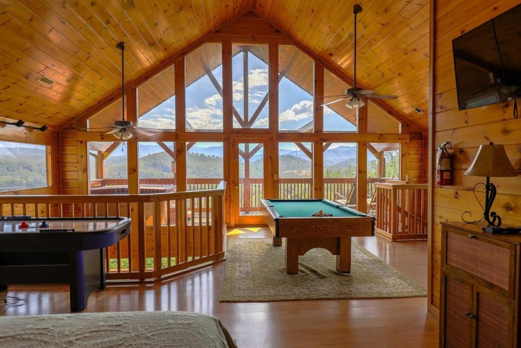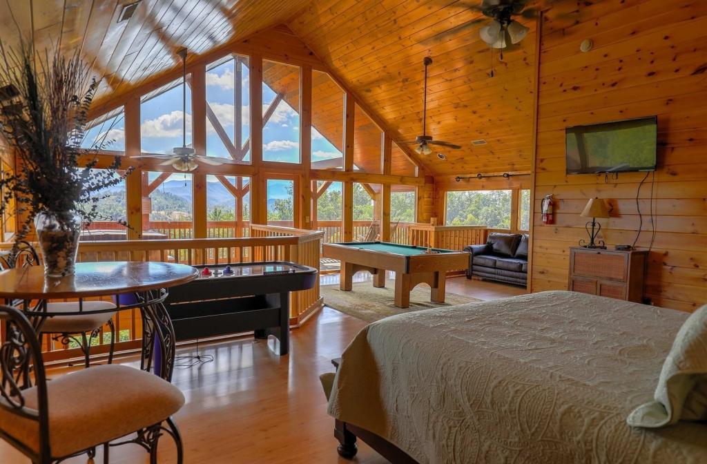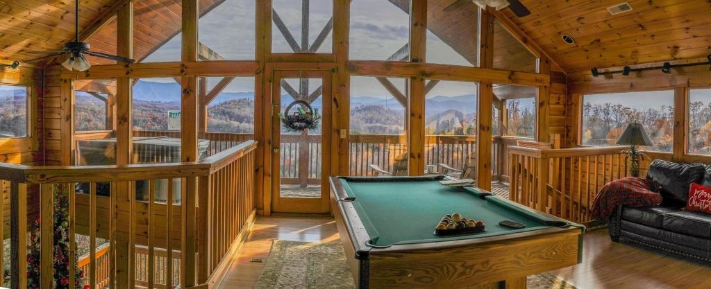 Four Seasons, Beautiful Cabin rental in Sevierville has 2 bedrooms, 2 bathrooms, 8 sleeps, 1 minimum stay Cabin for rent in Sevierville Tennessee with the amenities and near by attractions , Air Conditioning, Balcony, Communal Pool, Fire extinguisher, Fireplace, Free WiFi, Game Room, Heating, Hot Tub, Internet, Kitchen, Linens Provided, Mountain View, Paper Towels, Parking, Pool Table, Smoke detector, Towels Provided, Washing Machine, Basic Soaps, Blender, Clothes Dryer, Coffee Maker , Dining Area, Dishes & Utensils, Dishwasher, Hair Dryer , Ice Maker, Iron & Board , Microwave, Outdoor Grill, Oven, Refrigerator, Stove, Television, Toaster, Toilet Paper, Golf, Health/beauty spa, Hiking, Mountain biking, Mountain climbing, Museums, Outlet shopping, Shopping, Theme parks, Water parks, Wildlife viewingfootball, Video Games, Smart TV, Jacuzzi, Family, Historic, Tourist Attractions, Emergency Exit Route, Requires Stairs , Cameras/Surveillance , Climbing/Play Structure