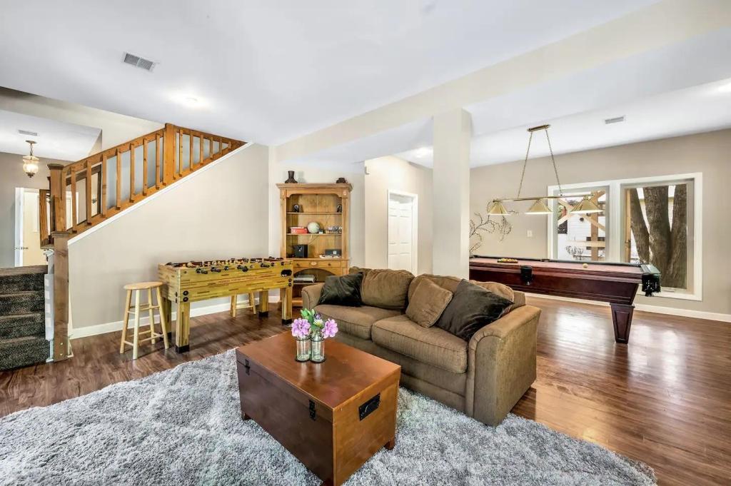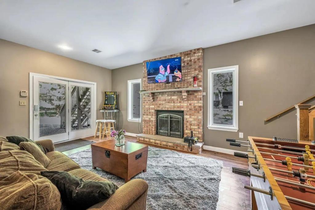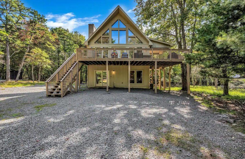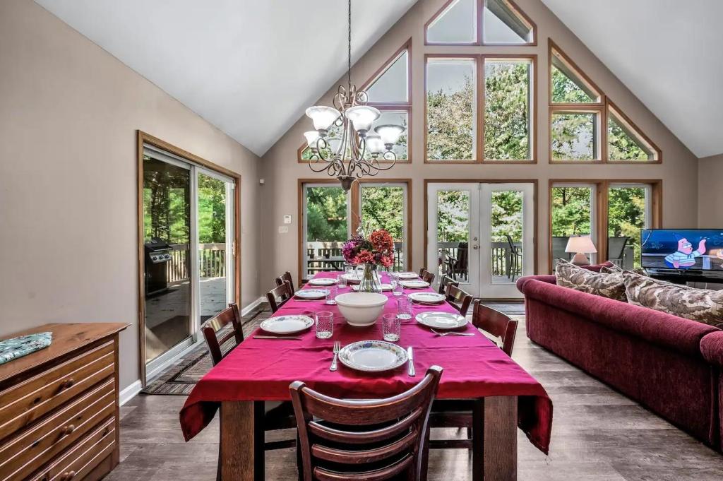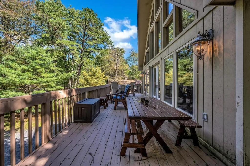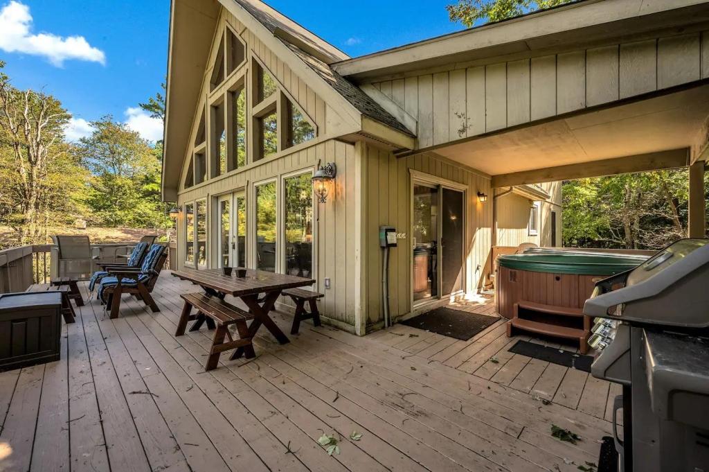 Stargaze Lodge, Beautiful House rental in Lake Harmony has 5 bedrooms, 3 bathrooms, 14 sleeps, 1 minimum stay House for rent in Lake Harmony Pennsylvania with the amenities and near by attractions , Air Conditioning, Deck/Patio, Fireplace, Free WiFi, Game Room, Heating, Hot Tub, Internet, Mountain View, Parking, Pet Friendly, Pool Table, Blender, Cable/Satellite TV, Ceiling Fans, Dishwasher, DVD Player, Microwave, Outdoor Grill, Oven, Refrigerator, Stove, Toaster, Washer/Dryer , Mountain biking, Mountain climbingFoosball Table, Stero System, Multiple Large Flat Screen TVs, Steam Shower, Dining Seats, Living Room Seats:(12)