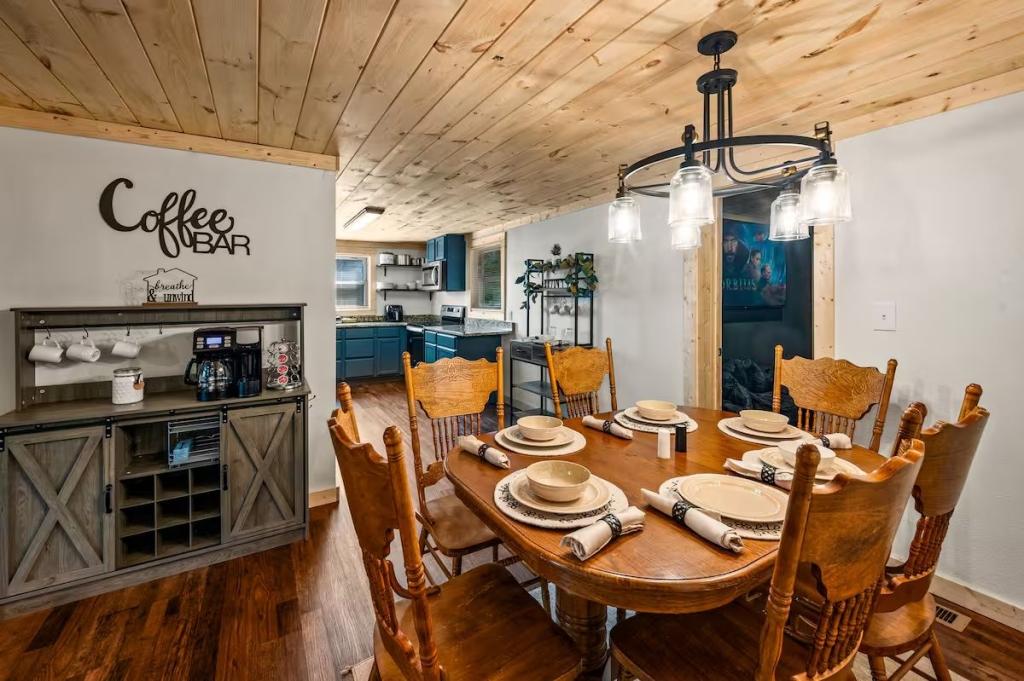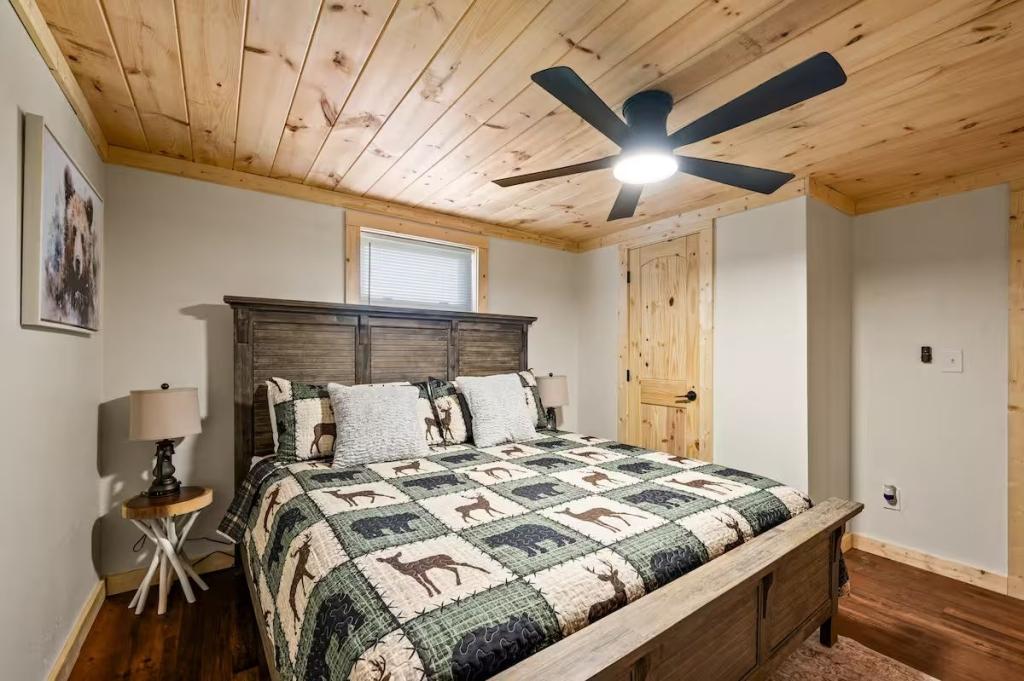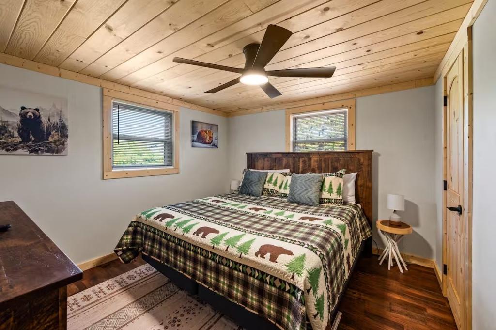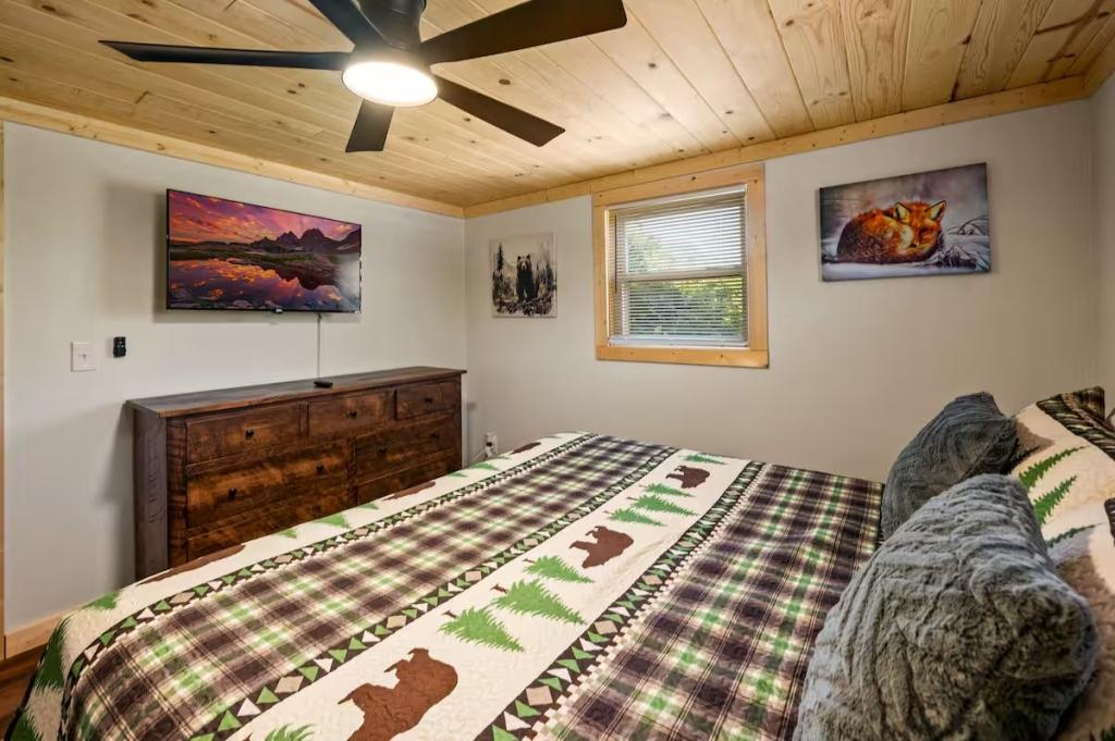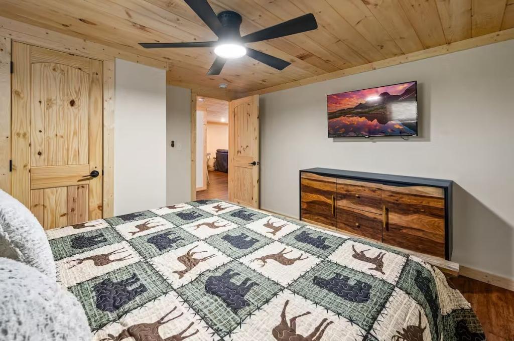 A+Location/HotTub/Theater/Playground/Arcade, Beautiful Cabin rental in Pigeon Forge has 3 bedrooms, 2 bathrooms, 7 sleeps, 1 minimum stay Cabin for rent in Pigeon Forge Tennessee with the amenities and near by attractions , Air Conditioning, Balcony, Carbon-monoxide detector, Deck/Patio, Fire extinguisher, Fireplace, Free WiFi, Heating, Hot Tub, Linens Provided, Parking, Pool Table, Smoke detector, Towels Provided, Washing Machine, Basic Soaps, Blender, Cable/Satellite TV, Ceiling Fans, Coffee Maker , Dining Area, Dishes & Utensils, Dishwasher, Hair Dryer , Hangers, Iron & Board , Microwave, Oven, Shampoo, Toaster, Washer/Dryer Hot water, Bath, Clothes storage: wardrobe, Arcade games, Cinema, Travel cot, Board games, Outdoor playground, Exterior security cameras on property, Dedicated workspace, Fridge, Cooking basics, Electric cooker, Wine glasses, Waste compactor, Private entrance, Private back garden, Firepit, Outdoor furniture, BBQ grill, Long-term stays allowed, Self check-in, Smart lock