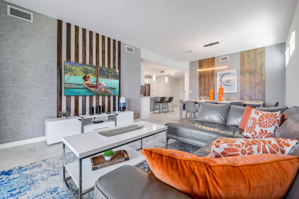 DREAM condo near Disney/Orlando*FREE water Park, Beautiful House rental in Kissimmee has 3 bedrooms, 2 bathrooms, 8 sleeps, 1 minimum stay House for rent in Kissimmee Florida with the amenities and near by attractions , Air Conditioning, Balcony, Carbon monoxide detector, Deck/Patio, Fire extinguisher, Free WiFi, Heating, Hot Tub, Kitchen, Linens Provided, Smoke detector, Towels Provided, Washing Machine, Waterfront, Basic Soaps, Blender, Coffee Maker , Dishwasher, First-aid kit, Freezer, Hair Dryer , Hangers, Iron & Board , Kettle, Microwave, Oven, Shampoo, Television, Toaster, Toilet Paper, Washer/Dryer Bath, Cleaning products, Body soap, Hot water, Shower gel, Extra pillows and blankets, Clothes drying rack, Clothes drying rack, Exercise equipment, Theme room, Travel cot, High chair, Children’s tableware, Exterior security cameras on property, Fridge, Cooking basics, Dishes and cutlery, Cooker, Wine glasses, Baking sheet, Dining table, Lake access, Resort access, Outdoor furniture, Outdoor dining area, Kayak, Free parking on premises, Pool, Lift, Long-term stays allowed(Allow stays of 28 days or more), Smart lock