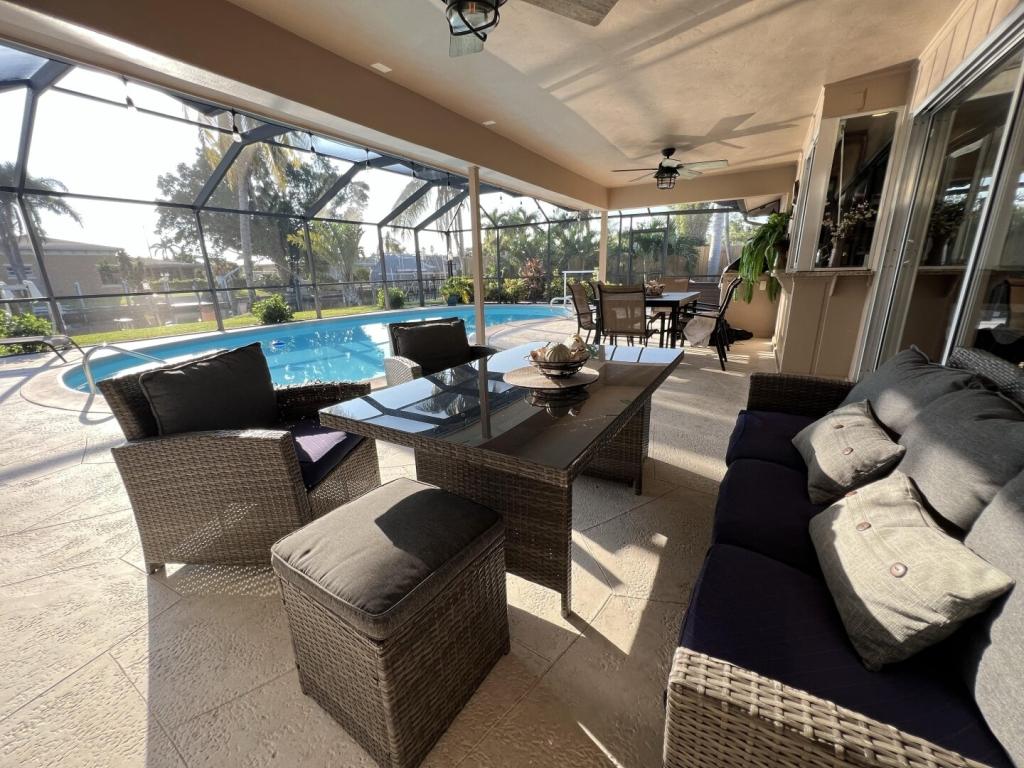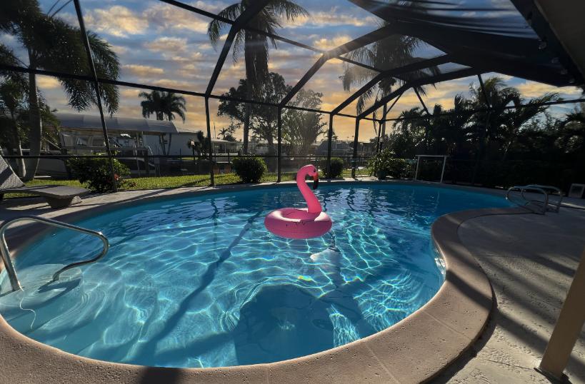 Coral Palms - POOL & CANAL w/ quick Gulf access. 1.5 miles to Yacht Club & Beach, Beautiful House rental in Cape Coral has 3 bedrooms, 2 bathrooms, 8 sleeps, 6 minimum stay House for rent in Cape Coral Florida with the amenities and near by attractions , Air Conditioning, Beach Chairs, Bicycles, Deck/Patio, Dock/Boat Slip, Free WiFi, Garage, Heated Pool, Heating, Internet, Kayak / Canoe, Kid Friendly, Kitchenette, Lanai, Linens Provided, Managed by Owner, Managed by Property Manager, Non-Smoking, Ocean View, Oceanfront, Parking, Pet Friendly, Porch / Veranda, Private Pool, Screen Porch, Towels Provided, Water View, Waterfront, Wireless Internet, Kitchen, Children Welcome, Swimming pool, Children allowed, No Smoking, Smoke detector, Exterior lighting, Outdoor Pool, Blender, Microwave, Cable/Satellite TV, DVD Player, Outdoor Grill, Television, Ceiling Fans, Freezer, Oven, Toaster, Coffee Maker , Hair Dryer , Refrigerator, Washer/Dryer , Dishes & Utensils, Iron & Board , Stove, Dishwasher, Heater, First-aid kit, Clothes Dryer, Dining Area, Hangers, Microwave/Air Fryer, Mini Refrigerator, Ironing Board, Swimming, Outlet shopping, Fishing, Surfing, Water sports, Boating, Museums, Water parks, Health/beauty spa, Zoo, Horseback riding, Antiquing, Paddle boating, Shopping, Wildlife viewing, Cycling, Hiking, Hunting, Jet skiing, Kayaking, Parasailing, Sailing, Scuba diving or snorkeling, Snorkeling, Snowmobiling, Water skiing, Water tubing, Wind-surfing, Hospital, fitness center, laundromat
