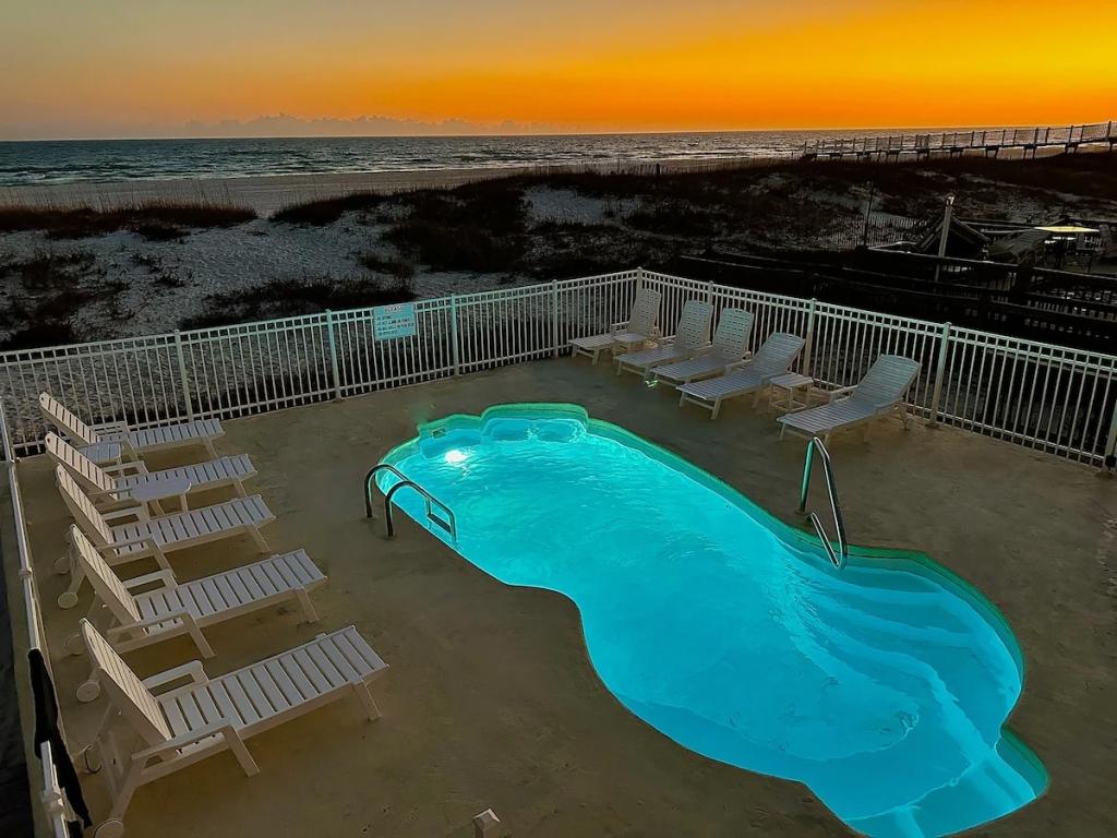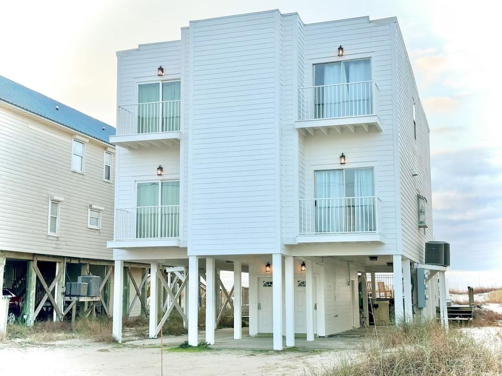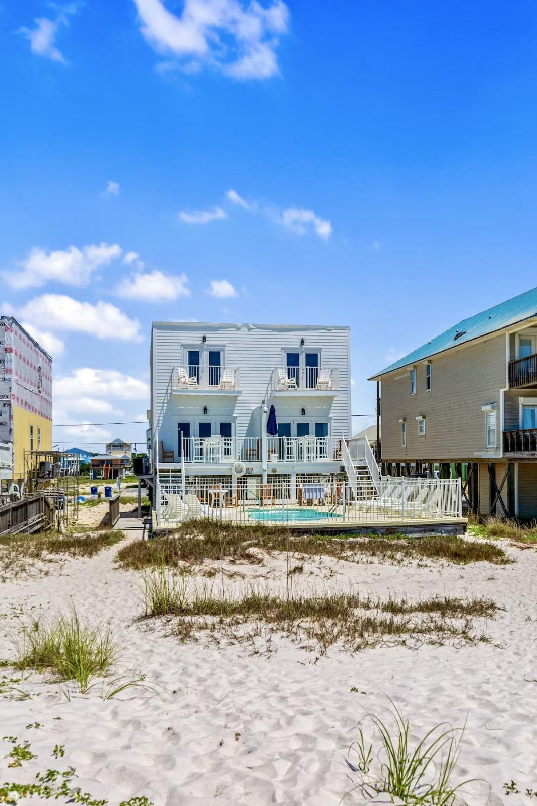 Dolphin Duplex side B- Beachfront HEATED POOL!! Gulf Shores - PET FRIENDLY, Beautiful House rental in Gulf Shores has 4 bedrooms, 3 bathrooms, 12 sleeps, 3 minimum stay House for rent in Gulf Shores Alabama with the amenities and near by attractions , Air Conditioning, Beach Chairs, Beach View, Beachfront, Fire extinguisher, Heating, Internet, Kitchen, Linens Provided, Oceanfront, Outdoor Pool, Parking, Pet Friendly, Private Pool, Smoke detector, Towels Provided, Washing Machine, Water View, Waterfront, Wireless Internet, Blender, Coffee Maker , Dishes & Utensils, Dishwasher, DVD Player, Hair Dryer , Iron & Board , Microwave, Oven, Refrigerator, Stove, Television, ToasterWiFi, Grill, Outdoor furniture, Water sports gear, Books, Smart TV, Satellite / cable, Video library, Travel crib, Dryer, One pet total (up to 20 lbs per pet), Welcoming dogs only, Minimum age limit for renters, Beach chairs, lounge chairs, and rafts available for use.