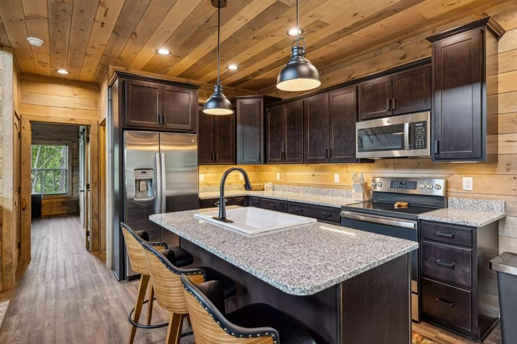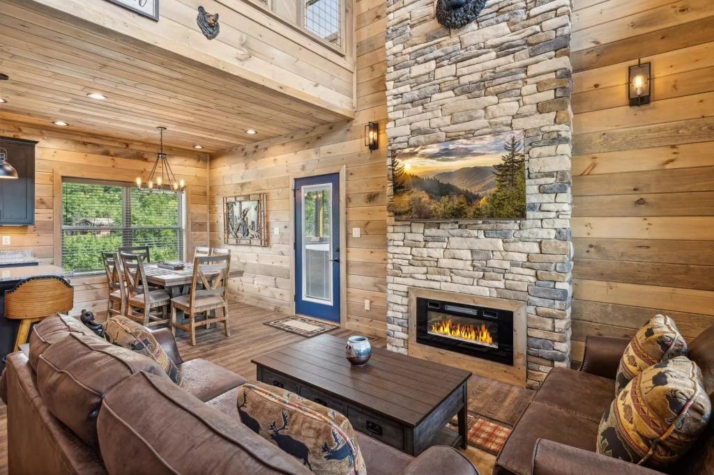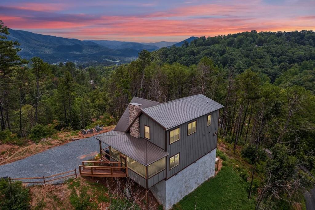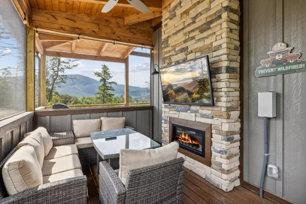 Imagine cozying up to the indoor-outdoor fireplace or gathering around the wood-burning fire pit on the porch, taking in the breathtaking panorama. The open-concept kitchen and living room provide the perfect setting for easy entertaining, while the screened-in porch, shuffleboard, cornhole, and arcade games ensure endless hours of fun and relaxation.