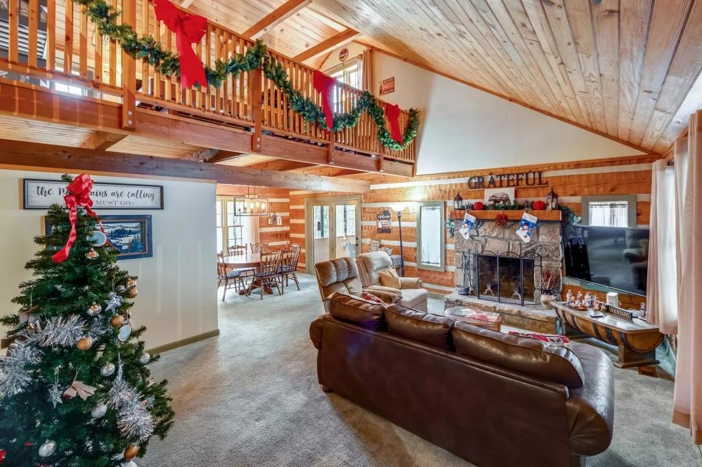 Mossie Oak Cabin - Summit Cabin Rentals, Beautiful Cabin rental in Sevierville has 2 bedrooms, 2 bathrooms, 10 sleeps, 1 minimum stay Cabin for rent in Sevierville Tennessee with the amenities and near by attractions , Air Conditioning, Carbon monoxide detector, Children allowed, Children Welcome, Exterior lighting, Fire extinguisher, Fireplace, Free WiFi, Full Kitchen, Heated Pool, Heating, Hot Tub, Internet, Kid Friendly, Linens Provided, No parties/events, No Pets Allowed, No Smoking, Non-Smoking, Paper Towels, Parking, Pool Table, Swimming pool, Towels Provided, Basic Soaps, Blender, Cable/Satellite TV, Ceiling Fans, Clothes Dryer, Coffee Grinder, Coffee Maker , Dining Area, Dishes & Utensils, Dishwasher, DVD Player, First-aid kit, Freezer, Hair Dryer , Hangers, Heater, Ice Maker, Ironing Board, Living Room, Microwave, Outdoor Grill, Oven, Refrigerator, Shampoo, Stove, Telephone, Television, Toaster, Toilet Paper, Waffle Iron, Washer/Dryer , Antiquing, Basketball court, Bay/sound, Bird watching, Boating, Cross country skiing, Cycling, Duty free shops, Ecotourism, fitness center, Gambling casinos, Golf, golf privileges optional, Health/beauty spa, Hiking, Horseback riding, Hospital, Hunting, laundromat, Mountain biking, Mountain climbing, Museums, Outlet shopping, Paddle boating, Parasailing, Rock climbing, Sailing, Shopping, Ski privileges optional, Skiing, Sledding, Snorkeling, Spelunking, Theme parks, Wildlife viewing, Wind-surfing, Winery tours, Zoo$400 worth of Free Tickets Daily, Decorated for Christmas, Tennis Court Access, Body Wash Starter Set, Dishes/Utensils, Dishware/Flatware/Glasses, Area: Pigeon Forge, Wood Burning Fireplace, Baking Dishes, Screened in Porch (1)