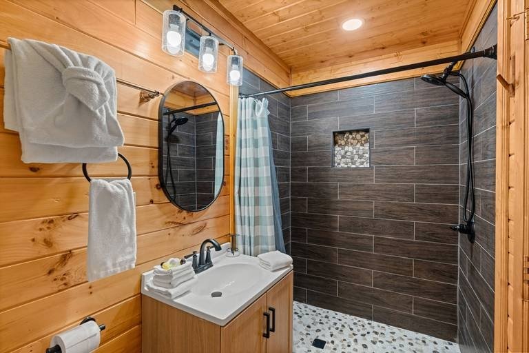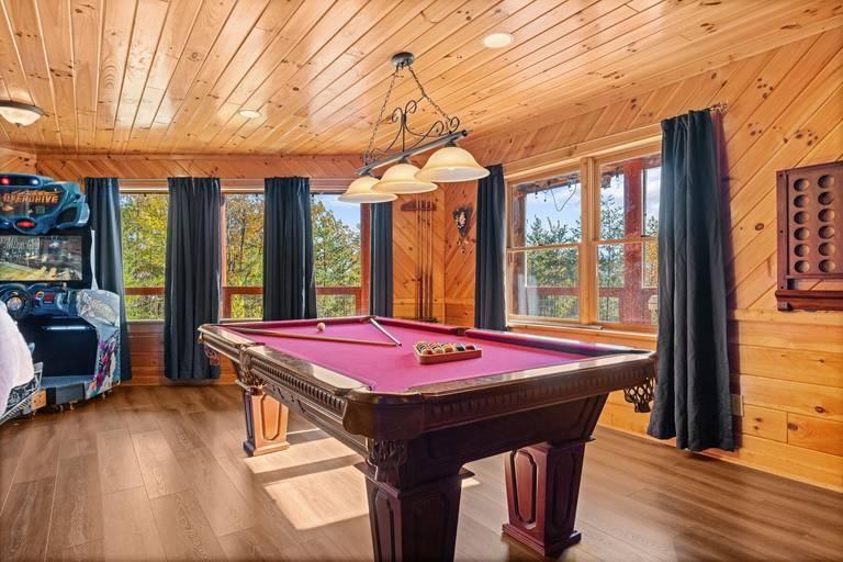 Evergreen Escape - Bear Tracts Vacation Cabins, Beautiful Cabin rental in Sevierville has 5 bedrooms, 4.5 bathrooms, 12 sleeps, 1 minimum stay Cabin for rent in Sevierville Tennessee with the amenities and near by attractions , Air Conditioning, Balcony, Carbon monoxide detector, Children allowed, Children Welcome, Deck/Patio, Exterior lighting, Fire extinguisher, Fireplace, Free WiFi, Full Kitchen, Game Room, Heated Pool, Heating, Hot Tub, Indoor Pool, Internet, Kid Friendly, Kitchen, Kitchenette, Linens Provided, Paper Towels, Parking, Private Pool, Towels Provided, Washing Machine, Wireless Internet, Basic Soaps, Blender, Cable/Satellite TV, Ceiling Fans, Clothes Dryer, Coffee Grinder, Coffee Maker , Dining Area, Dishes & Utensils, Dishwasher, DVD Player, First-aid kit, Freezer, Hair Dryer , Hangers, Heater, Ice Maker, Ironing Board, Kettle, Living Room, Microwave, Outdoor Grill, Oven, Refrigerator, Shampoo, Stove, Telephone, Television, Toaster, Toilet Paper, Waffle Iron, Washer/Dryer , Antiquing, Basketball court, Bay/sound, Bird watching, Boating, Cross country skiing, Cycling, Duty free shops, Ecotourism, fitness center, Gambling casinos, golf privileges optional, Health/beauty spa, Hiking, Horseback riding, Hospital, Hunting, Jet skiing, laundromat, Mountain biking, Mountain climbing, Museums, Outlet shopping, Paddle boating, Parasailing, Rock climbing, Sailing, Shopping, Ski lift privileges, Ski privileges optional, Sledding, Spelunking, Theme parks, Wildlife viewing, Wind-surfing, Winery tours, ZooCommunity/Resort Pool, Private Indoor Pool, Fire Pit or Outdoor Fireplace