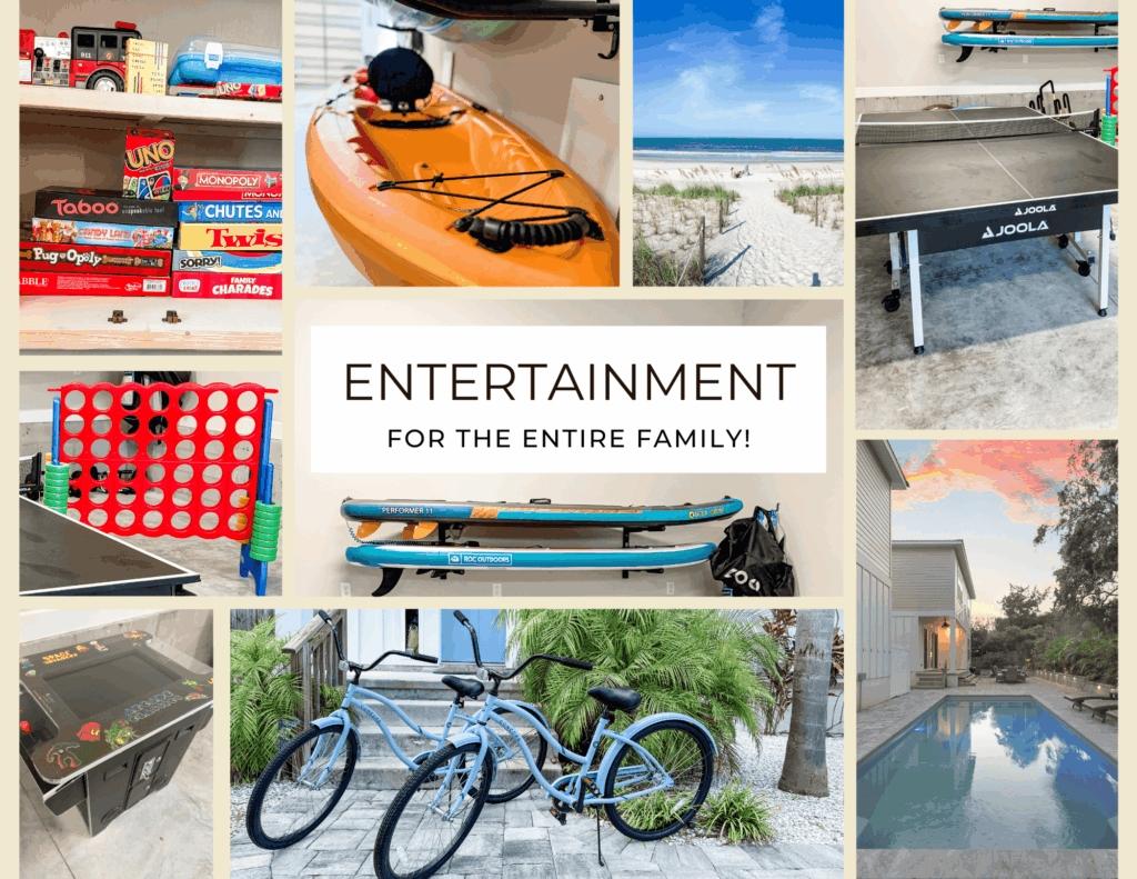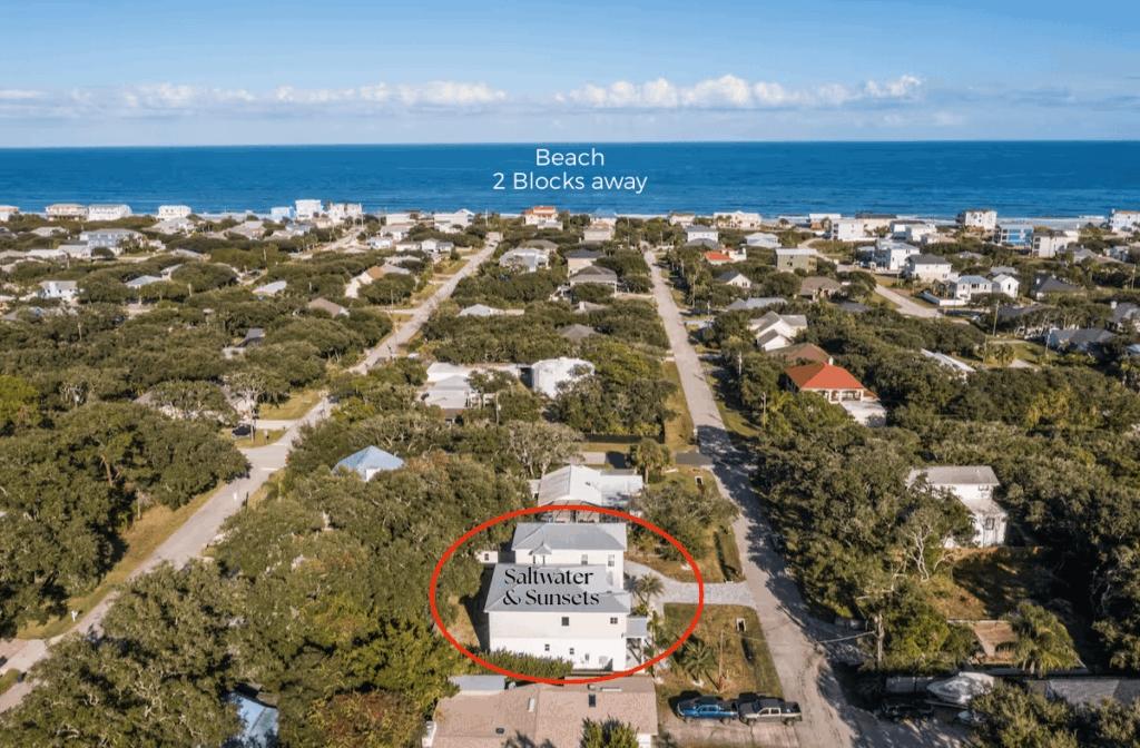 Escape to Coastal Luxury at Saltwater & Sunsets — A Vilano Beach Retreat., Beautiful House rental in St. Augustine has 5 bedrooms, 6 bathrooms, 19 sleeps, 3 minimum stay House for rent in St. Augustine Florida with the amenities and near by attractions , Air Conditioning, Beach Chairs, Beach View, Beachfront, Carbon-monoxide detector, Children allowed, Deck/Patio, Fire extinguisher, Free WiFi, Game Room, Heated Pool, Heating, Hot Tub, Internet, Kayak / Canoe, Kitchen, Linens Provided, Ocean View, Outdoor Pool, Parking, Ping Pong Table, Smoke detector, Towels Provided, Wireless Internet, Basic Soaps, Blender, Cable/Satellite TV, Ceiling Fans, Clothes Dryer, Coffee Maker , Dining Area, Dishwasher, First-aid kit, Freezer, Hair Dryer , Hangers, Heater, Ironing Board, Microwave, Outdoor Grill, Oven, Shampoo, Stove, Television, Toaster, GolfVentilation Fan, Closet / Drawers, Extra pillows and blankets, Fenced pool, Pots Pans, Essentials, Cooking Basics, Emergency exit, Crockery and Cutlery, Kitchen island, Laptop Friendly, Wine glasses, Baking sheet, Deadbolt lock, Children’s dinnerware, Pack n Play travel crib, Baby bath, Bathtub, Private entrance, Barbeque utensils, Fire pit – Propane, Sauna, Contactless check-in, Office / Desk, Uses Disinfectants, Baby High Chair, Desk chair, Lock on bedroom, Computer monitor, Printer, Surveillance, Enhanced Cleaning,