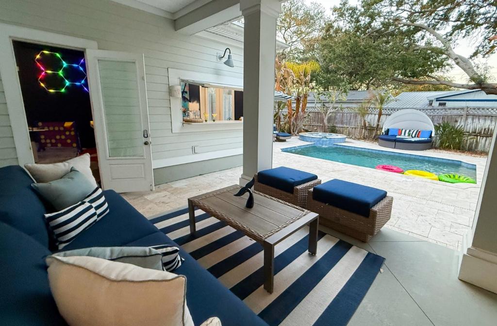 Escape to Coastal Luxury at Coast & Palms — A Vilano Beach Retreat., Beautiful House rental in St. Augustine has 4 bedrooms, 3.5 bathrooms, 16 sleeps, 3 minimum stay House for rent in St. Augustine Florida with the amenities and near by attractions , Air Conditioning, Beach Chairs, Beach View, Beachfront, Carbon-monoxide detector, Children allowed, Deck/Patio, Fire extinguisher, Free WiFi, Game Room, Heated Pool, Heating, Hot Tub, Internet, Kayak / Canoe, Kitchen, Linens Provided, Ocean View, Outdoor Pool, Parking, Ping Pong Table, Smoke detector, Towels Provided, Wireless Internet, Basic Soaps, Blender, Cable/Satellite TV, Ceiling Fans, Clothes Dryer, Coffee Maker , Dining Area, Dishwasher, First-aid kit, Freezer, Hair Dryer , Hangers, Heater, Ironing Board, Microwave, Outdoor Grill, Oven, Shampoo, Stove, Television, Toaster, GolfVentilation Fan, Closet / Drawers, Extra pillows and blankets, Fenced pool, Pots Pans, Essentials, Cooking Basics, Emergency exit, Crockery and Cutlery, Kitchen island, Laptop Friendly, Wine glasses, Baking sheet, Deadbolt lock, Children’s dinnerware, Pack n Play travel crib, Baby bath, Bathtub, Private entrance, Barbeque utensils, Fire pit – Propane, Sauna, Contactless check-in, Office / Desk, Uses Disinfectants, Baby High Chair, Desk chair, Lock on bedroom, Computer monitor, Printer, Surveillance, Enhanced Cleaning,