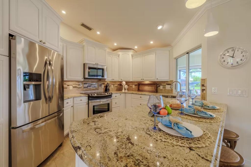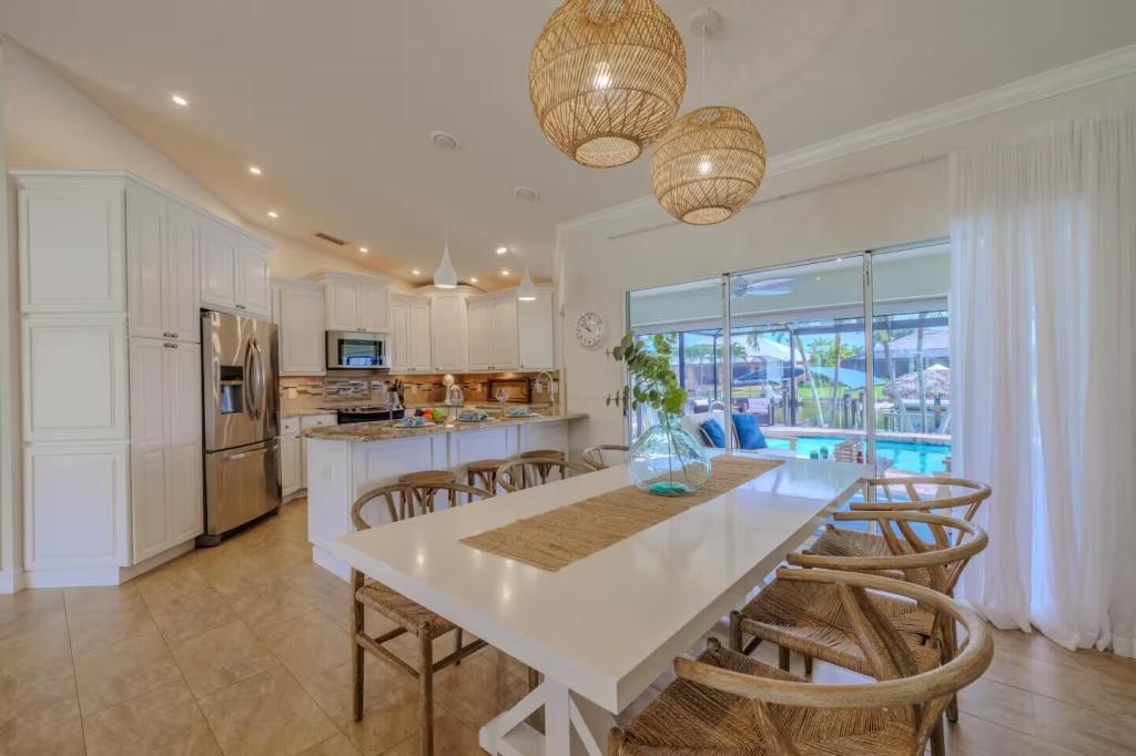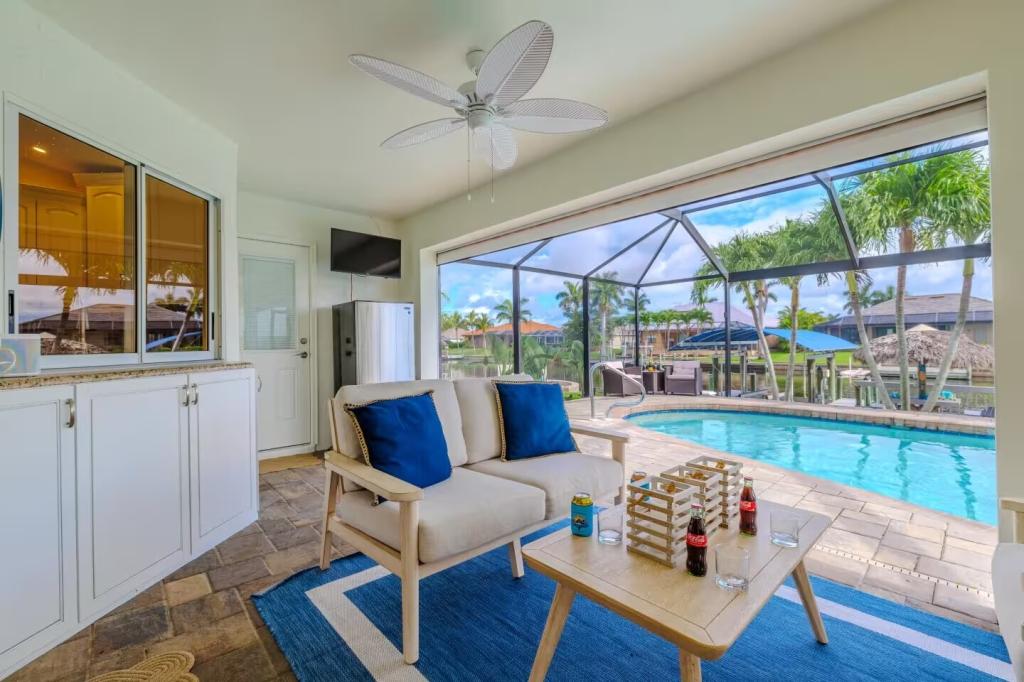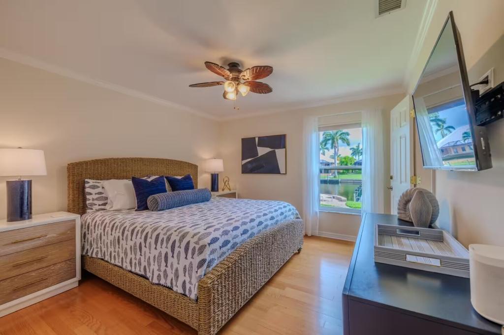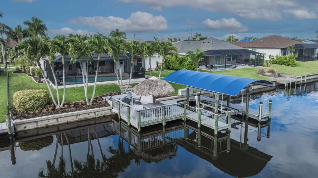 Villa Barefoot Cove | Stars Vacation Rentals, Beautiful House rental in Cape Coral has 3 bedrooms, 2 bathrooms, 6 sleeps, 1 minimum stay House for rent in Cape Coral Florida with the amenities and near by attractions , Air Conditioning, Carbon monoxide detector, Carbon-monoxide detector, Children allowed, Children Welcome, Deck/Patio, Exterior lighting, Fire extinguisher, Fireplace, Free WiFi, Full Kitchen, Heated Pool, Heating, Hot Tub, Internet, Kid Friendly, Kitchen, Kitchenette, Linens Provided, No parties/events, No Pets Allowed, No Smoking, Non-Smoking, Paper Towels, Parking, Smoke detector, Towels Provided, Washing Machine, Water View, Waterfront, Wireless Internet, Basic Soaps, Blender, Cable/Satellite TV, Ceiling Fans, Clothes Dryer, Coffee Grinder, Coffee Maker , Dining Area, Dishes & Utensils, Dishwasher, DVD Player, First-aid kit, Freezer, Hair Dryer , Hangers, Heater, Ice Maker, Kettle, Living Room, Microwave, Microwave/Air Fryer, Outdoor Grill, Oven, Refrigerator, Shampoo, Stove, Telephone, Television, Toaster, Toilet Paper, Waffle Iron, Washer/Dryer , Antiquing, Basketball court, Bay/sound, Bird watching, Boating, Cross country skiing, Cycling, Duty free shops, Ecotourism, Fishing, fitness center, Gambling casinos, golf privileges optional, Health/beauty spa, Horseback riding, Hospital, laundromat, Museums, Shopping, Swimming, Theme parks, Water parks