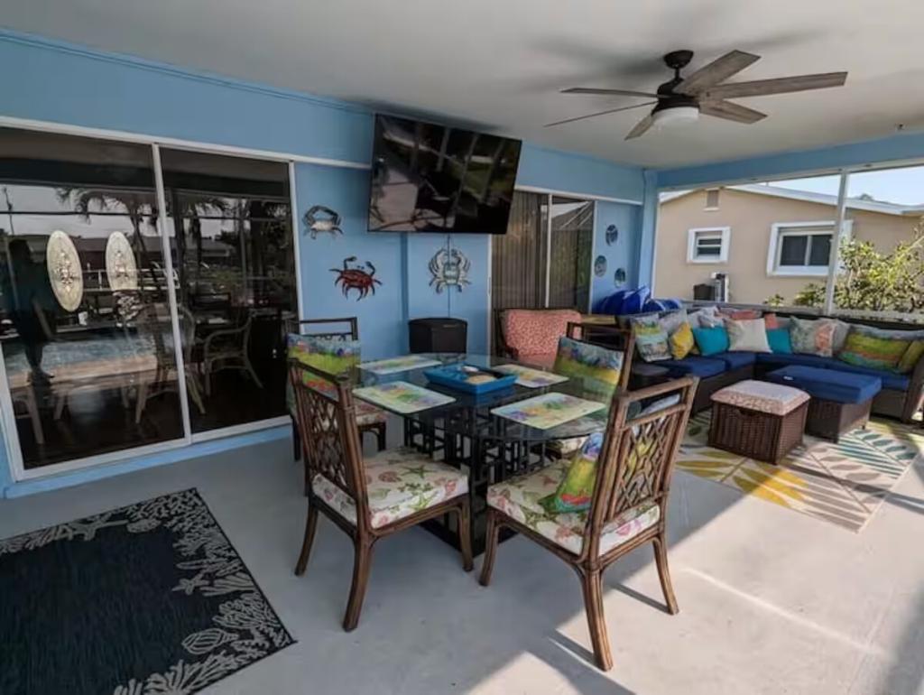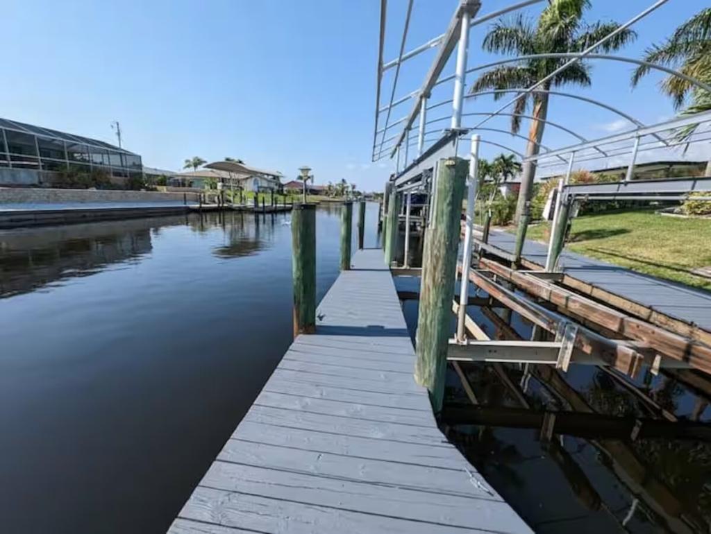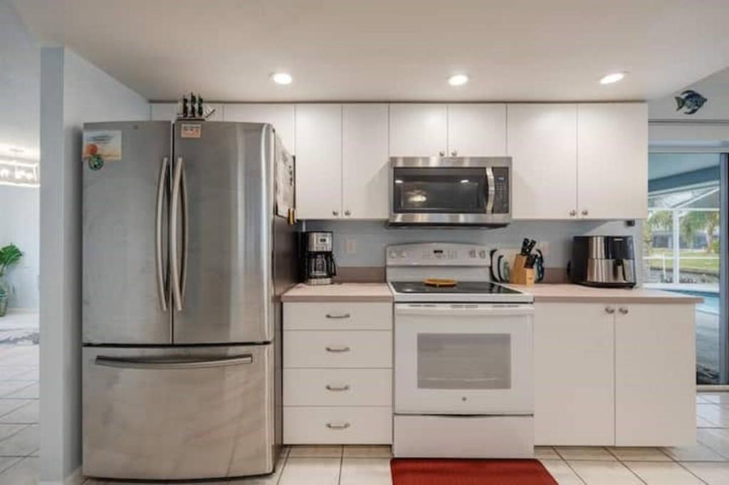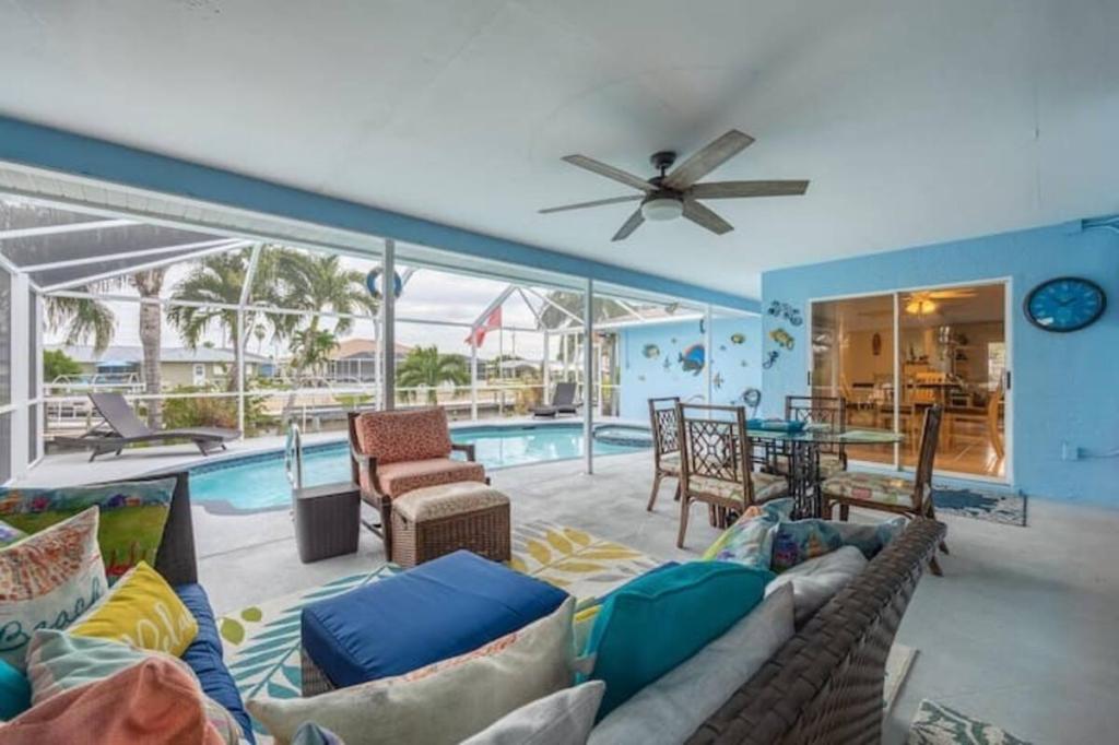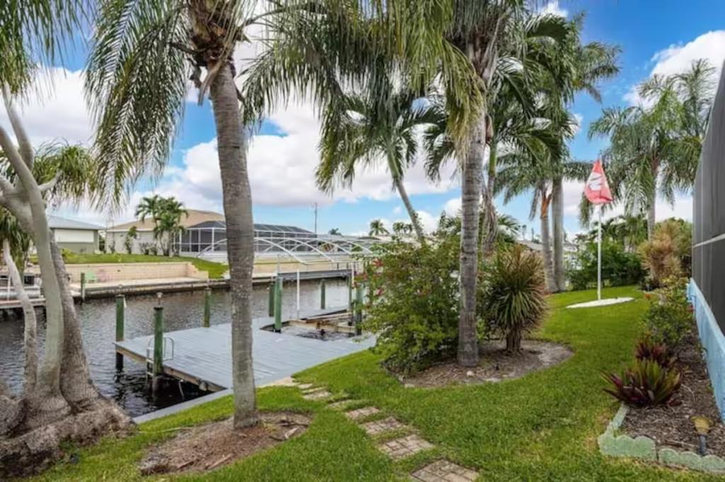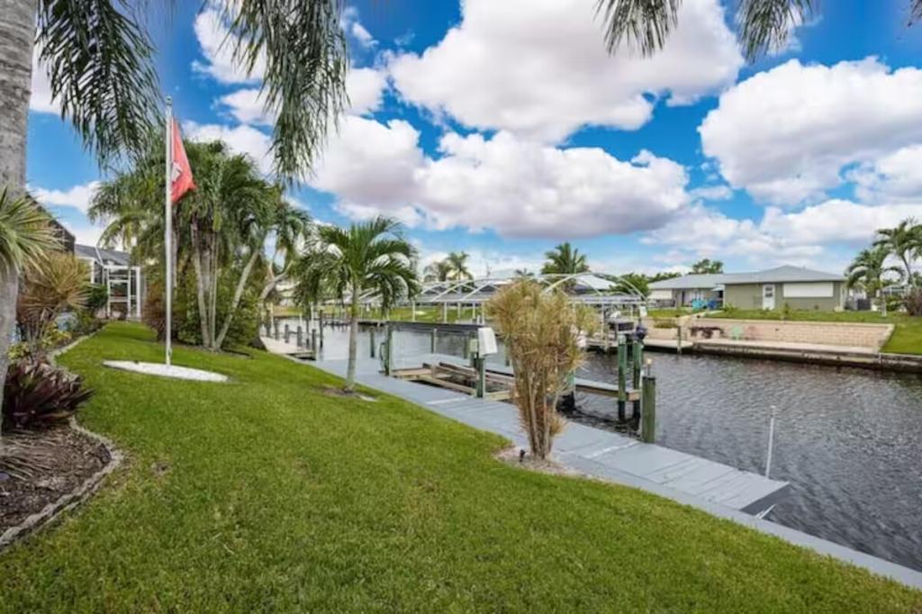 Calypso Cove Waterfront Oasis w Pool & Spa, Beautiful Condo rental in Cape Coral has 3 bedrooms, 2 bathrooms, 8 sleeps, 1 minimum stay Condo for rent in Cape Coral Florida with the amenities and near by attractions , Air Conditioning, Carbon monoxide detector, Children Welcome, Deck/Patio, Exterior lighting, Fire extinguisher, Fireplace, Free WiFi, Full Kitchen, Heated Pool, Heating, Internet, Linens Provided, Managed by Owner, No parties/events, No Pets Allowed, No Smoking, Parking, Smoke detector, Swimming pool, Towels Provided, Washing Machine, Water View, Waterfront, Basic Soaps, Blender, Cable/Satellite TV, Ceiling Fans, Clothes Dryer, Coffee Grinder, Coffee Maker , Dining Area, Dishes & Utensils, Dishwasher, DVD Player, First-aid kit, Freezer, Hair Dryer , Hangers, Heater, Ice Maker, Iron & Board , Ironing Board, Kettle, Living Room, Microwave, Outdoor Grill, Oven, Refrigerator, Shampoo, Stove, Telephone, Television, Toaster, Toilet Paper, Waffle Iron, Washer/Dryer Bed sheets, Dedicated workspace, Pots and pans, oil, salt and pepper, Free on-street parking, Self check-in, Keypad,