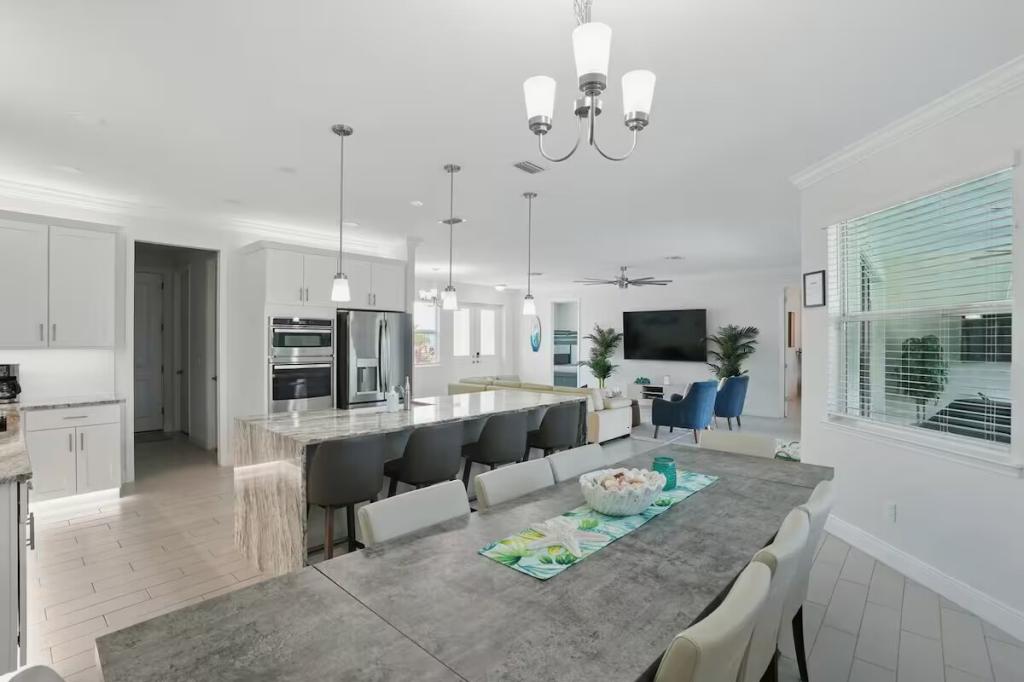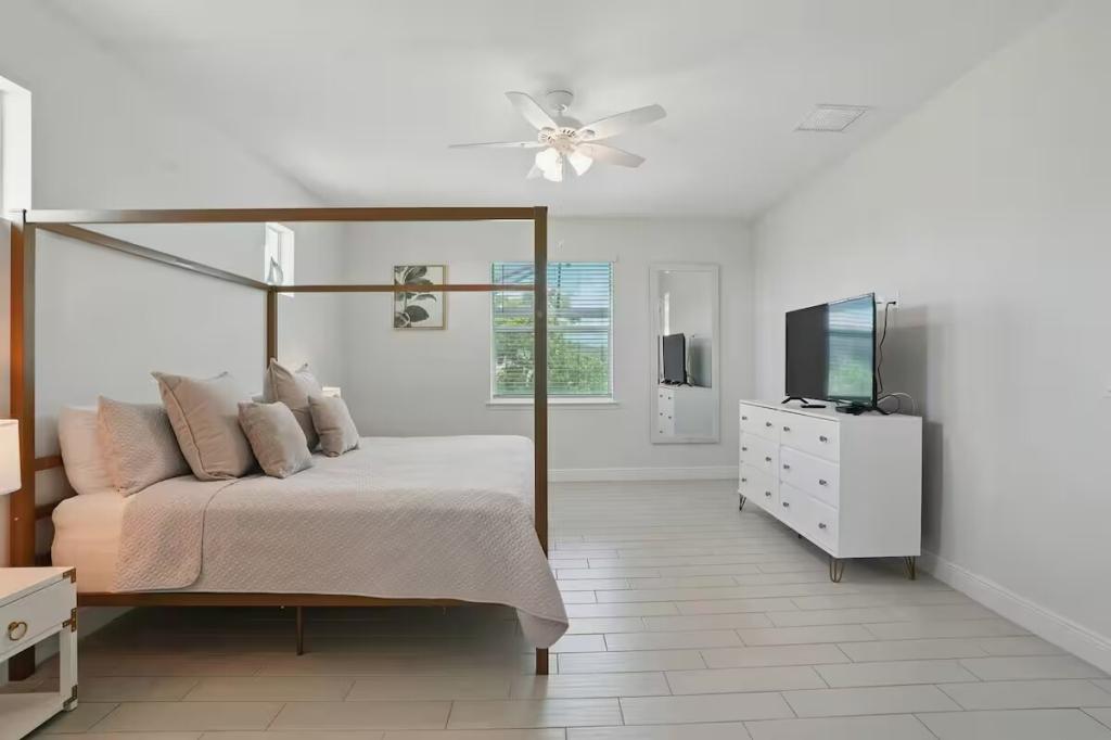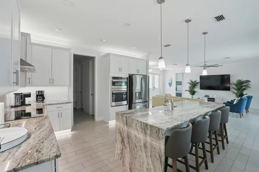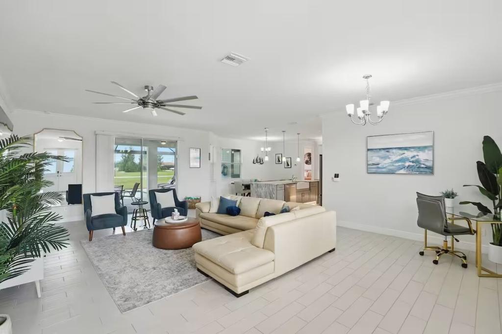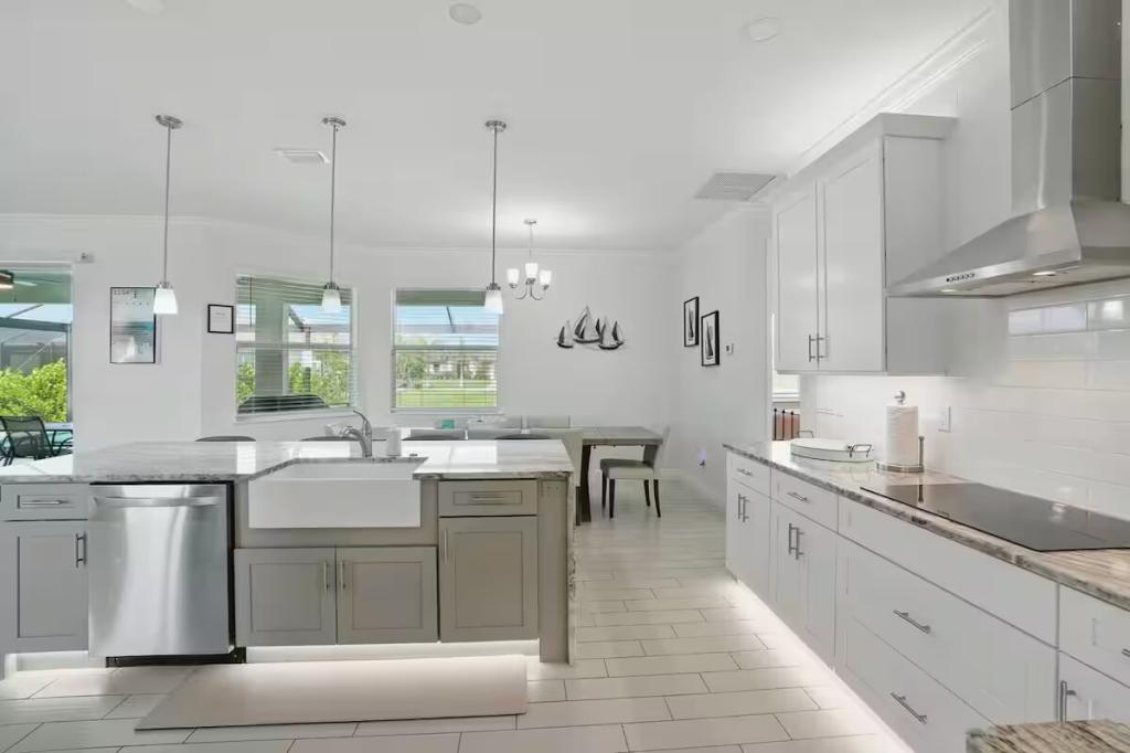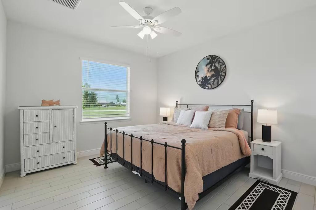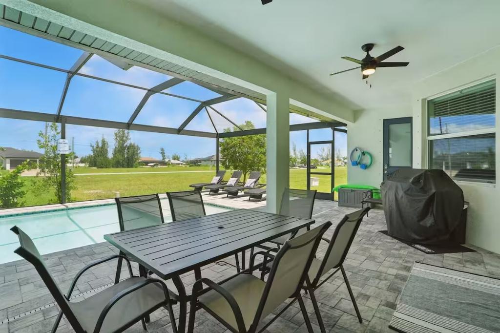 Cape Haven - Heated Pool & Sleeps 12, Beautiful House rental in Cape Coral has 4 bedrooms, 3 bathrooms, 12 sleeps, 1 minimum stay House for rent in Cape Coral Florida with the amenities and near by attractions , Air Conditioning, Carbon monoxide detector, Children Welcome, Deck/Patio, Exterior lighting, Fire extinguisher, Free WiFi, Full Kitchen, Heating, Internet, Kayak / Canoe, Linens Provided, Managed by Owner, No parties/events, No Pets Allowed, No Smoking, Parking, Smoke detector, Swimming pool, Towels Provided, Washing Machine, Water View, Waterfront, Wireless Internet, Basic Soaps, Blender, Cable/Satellite TV, Ceiling Fans, Clothes Dryer, Coffee Grinder, Coffee Maker , Dining Area, Dishes & Utensils, Dishwasher, DVD Player, First-aid kit, Freezer, Hair Dryer , Hangers, Heater, Ice Maker, Iron & Board , Kettle, Living Room, Microwave, Outdoor Grill, Oven, Refrigerator, Shampoo, Stove, Telephone, Television, Toaster, Toilet Paper, Waffle Iron, Washer/Dryer , Antiquing, Basketball court, Bay/sound, Boating, Cycling, Ecotourism, Fishing, fitness center, Golf, Golf Course View, Health/beauty spa, Hospital, Hunting, Kayaking, laundromat, Museums, Outlet shopping, Parasailing, Sailing, Scuba diving or snorkeling, Snorkeling, Snowboarding, Surfing, Swimming, Water skiing, Water sports, Water tubing, Wind-surfingTumble dryer, Bed sheets, Bed linen, Pots and pans, oil, salt and pepper, Free on-street parking, Self check-in, Keypad