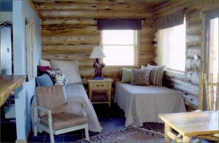 The Copper Cabin is another hand peeled and scribed Bozeman log cabin. This Montana cabin is a slightly larger vacation rentals than the Silver Creek Cabin having a separate bedroom with a queen size bed and two single beds. Copper Cabin vacation rental features a nice bath with a huge shower; fully equipped kitchen w/a full-size stove, refrigerator and cabinets made of 100 year old fir with copper insets and unique drawer pulls.