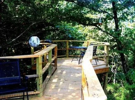 Canebrake features a modified full kitchen with a refrigerator, stove top, small toaster oven, microwave, coffee maker, blender and a full gas grill on the deck. The bedroom has a queen sized bed and the living room is furnished with a click-futon and a comfortable glider-rocker. Canebrake sleeps 2 very comfortably in the bedroom and at least one other, maybe 2, on the futon. The bathroom has a shower and other accommodations. This cottage has 2 decks, one with comfortable seating, a table and the grill, the other with a soaking tub and bench. We limit the Canebrake cottage to 4 guests at a time.