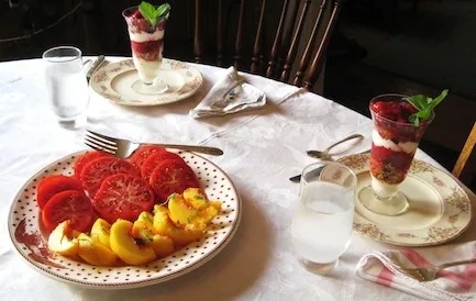 mostly organic, often featuring seasonal local produce harvested from our own organic garden. We serve vegetarian and non-vegetarian selections, freshly baked breads and side dishes, fresh fruits and juices along with fair trade coffees and teas. If you would like a light dinner waiting for you on your arrival - or would like a night off during your stay - we can cook a casserole or a hearty soup made from organic ingredients served with crusty bread, salad, dessert and tea for $25 per person. Please give 24 hours notice.