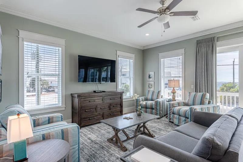 Take the stairs to the top floor where you can relax in the common area, which has a futon couch and flat screen TV. Directly to the right of the stairs is the queen over king bunk bed room with connected bathroom and flat screen TV. Across the hall is another queen size bedroom with en-suite and a flat screen TV. At the south end of the home are the two king master suites. Each room as a double vanity in the bathroom, a flat screen TV, and best of all, direct access to a furnished balcony. The sliding glass doors will lead guests to relaxation while taking in the sun and watching the waves across the street.