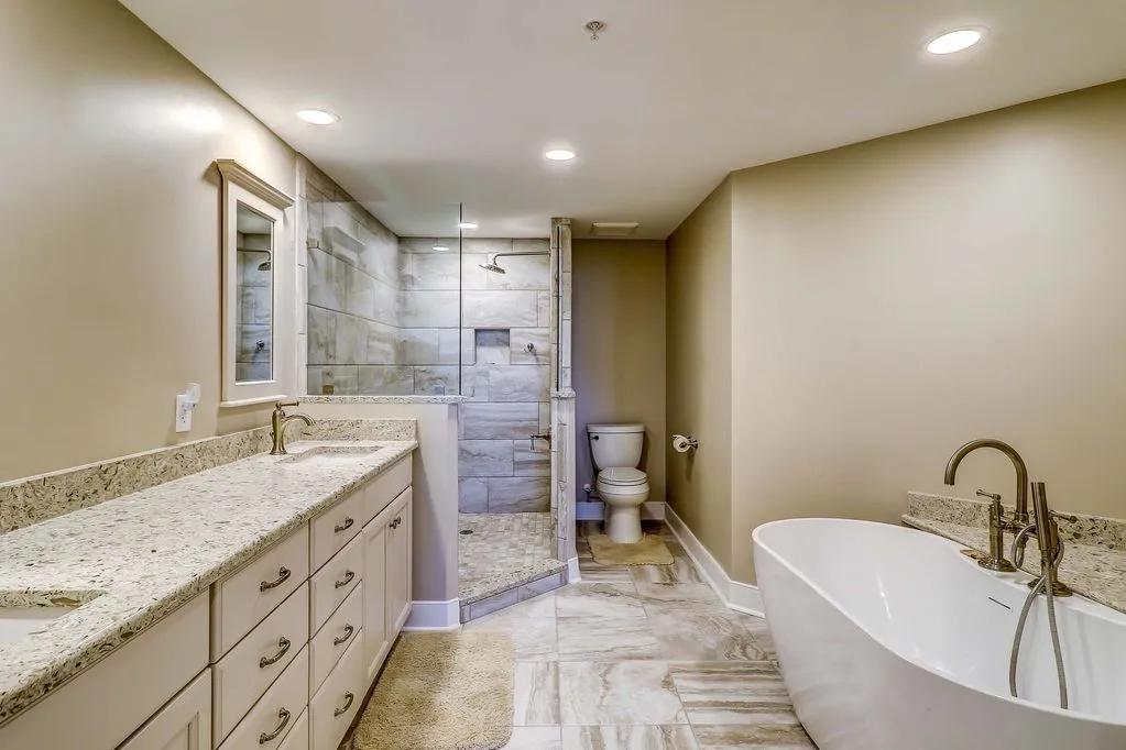 - King bed in master with renovated en suite bath that has soaking tub and glass-enclosed walk-in shower