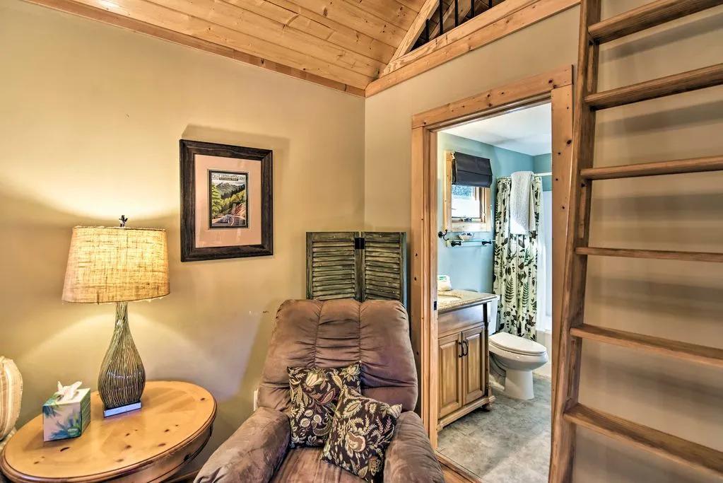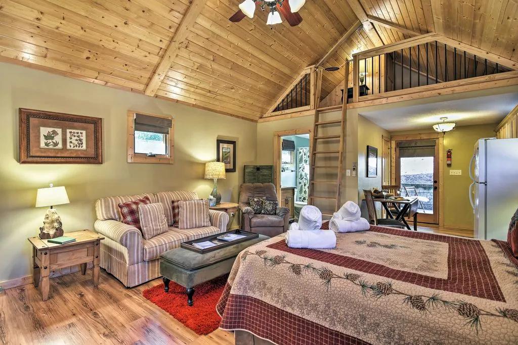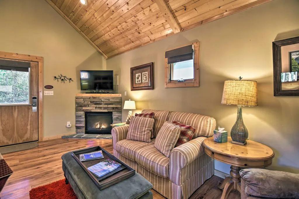 You'll feel right at home while you stay in 'Evergreen.' High ceilings, large windows, and an open-floor plan come together to create a warm, welcoming, and comfortable cabin the whole family - and your pup - will love.
