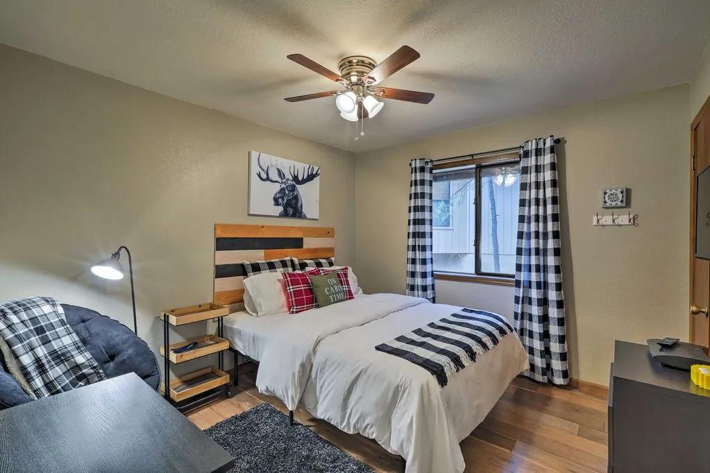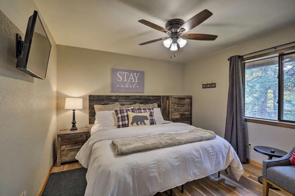 Munds Park Cabin w/Wraparound Deck & Fire Pit, Beautiful Cabin rental in Munds Park has 3 bedrooms, 2 bathrooms, 8 sleeps, 2 minimum stay Cabin for rent in Munds Park Arizona with the amenities and near by attractions , Deck/Patio, Free WiFi, Heated Pool, Heating, Hot Tub, Internet, Linens Provided, Managed by Property Manager, Non-Smoking, Parking, Porch / Veranda, Towels Provided, Wireless Internet, Washing Machine, Kitchen, Fire extinguisher, Children allowed, Blender, Microwave, Telephone, Cable/Satellite TV, DVD Player, Outdoor Grill, Television, Ceiling Fans, Freezer, Oven, Toaster, Coffee Maker , Hair Dryer , Refrigerator, Washer/Dryer , Dishes & Utensils, Iron & Board , Stove, Dishwasher, Coffee Grinder, Heater, First-aid kit, Clothes Dryer, Ice Maker, Dining Area, Basic Soaps, Toilet Paper, Living Room, Kettle