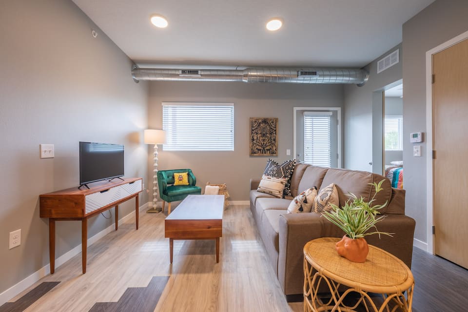 "Frieda" 2BD/2BA Downtown "Market District" Apt!, Beautiful Apartment rental in Des Moines has 2 bedrooms, 2 bathrooms, 5 sleeps, 2 minimum stay Apartment for rent in Des Moines Iowa with the amenities and near by attractions , Air Conditioning, Balcony, Paper Towels, Deck/Patio, Elevator, Fitness Room , Free WiFi, Full Kitchen, Heating, Internet, Kid Friendly, Linens Provided, Managed by Property Manager, Non-Smoking, Parking, Pet Friendly, Porch / Veranda, Towels Provided, Wheelchair Accessible, Wireless Internet, Washing Machine, Kitchen, Children Welcome, Fire extinguisher, Children allowed, No Smoking, No parties/events, Smoke detector, Carbon-monoxide detector, Exterior lighting, Microwave, Cable/Satellite TV, Television, Ceiling Fans, Freezer, Oven, Toaster, Coffee Maker , Hair Dryer , Refrigerator, Washer/Dryer , Dishes & Utensils, Iron & Board , Stove, Dishwasher, Heater, First-aid kit, Clothes Dryer, Ice Maker, Dining Area, Basic Soaps, Toilet Paper, Living Room, Shampoo, HangersLift, Bath, Conditioner, Body wash, Hot water, Shower gel, bed sheets, Bed linen, Extra pillows and blankets, Iron, Ethernet connection, TV with standard cable/satellite, Cot, Travel cot, High chair, Dedicated workspace, Cooking basics(Pots and pans- oil- salt and pepper), Dishes and silverware, Baking sheet, Barbecue utensils, Launderette nearby, Garden, BBQ grill, Free parking on premises, Free on-street parking, Lift, Gym, Paid parking off premises, Single level home, Luggage drop-off allowed, Long-term stays allowed, Self check-in, Smart lock