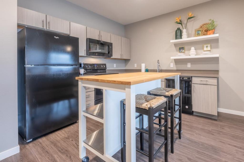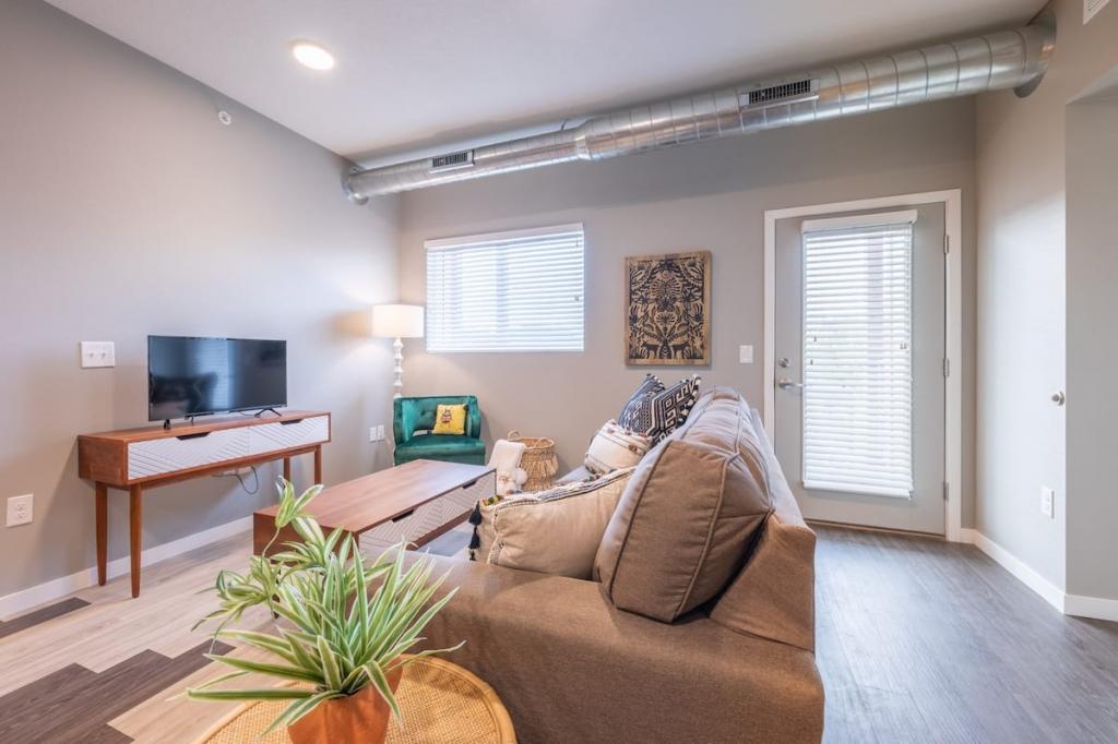 The open concept layout makes almost any activity much more enjoyable. The large kitchen island is perfect for meals, work or entertainment and has seating. All the necessary cooking options (pots, pans, utensils), a Keurig and pods, wine glasses, corkscrew, toaster, bakeware and more are all included. The kitchen flows seamlessly to the living room with a smart TV (Hulu Live + DVR included) and a door to the private patio.