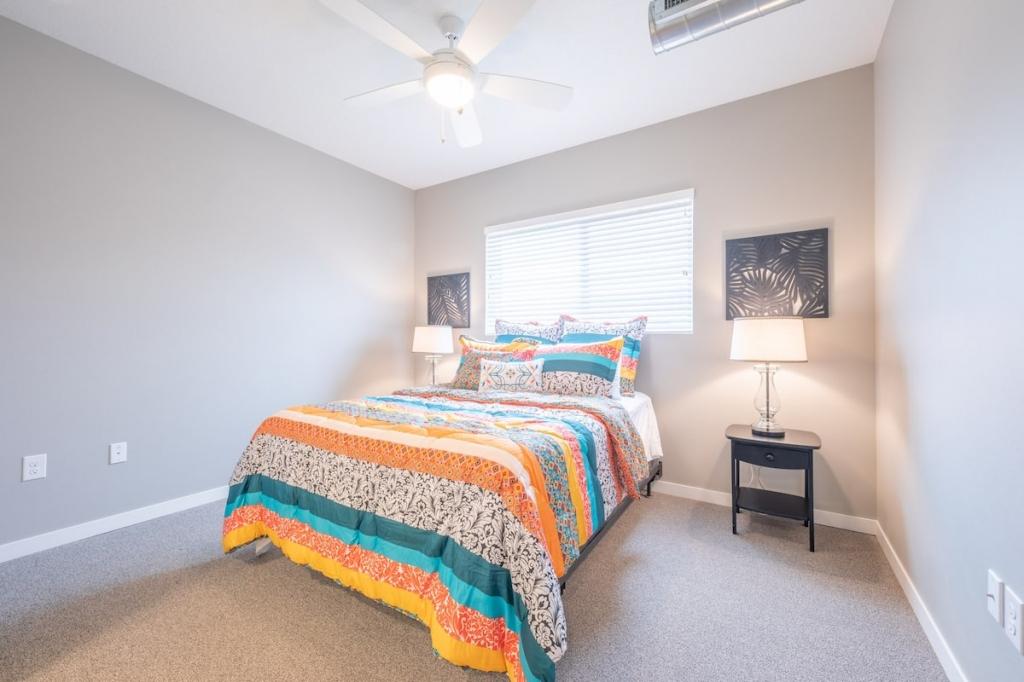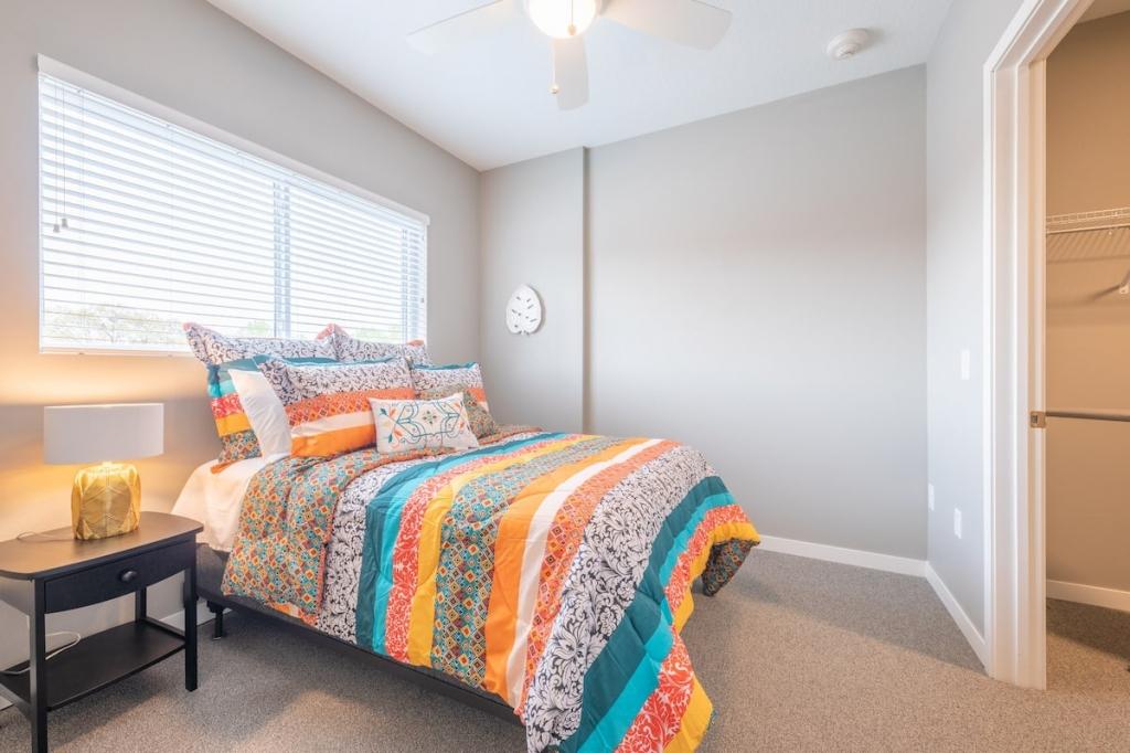 The bedrooms are separated by the living area, which is great for privacy as well as their own door. The first bedroom has a full-sized bed, nightstand, expansive walk-in closet and room darkening curtains (not pictured). The master bedroom has a queen-sized bed, nightstands, walk-in closet, attached bathroom and room darkening curtains (not pictured).