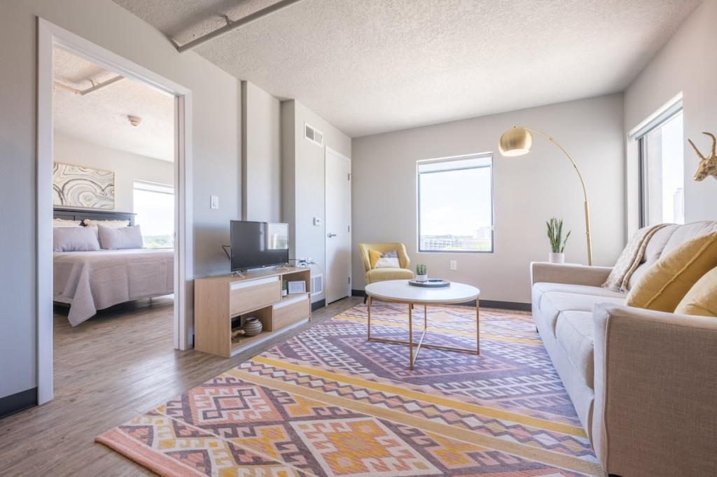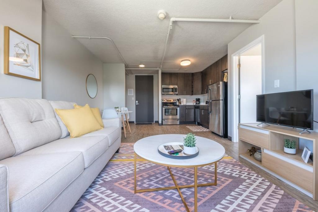 "Marigold" 1BD Downtown East Village Apt!, Beautiful Apartment rental in Des Moines has 1 bedrooms, 1 bathrooms, 3 sleeps, 1 minimum stay Apartment for rent in Des Moines Iowa with the amenities and near by attractions , Air Conditioning, Balcony, Paper Towels, Deck/Patio, Elevator, Fitness Room , Free WiFi, Full Kitchen, Heating, Internet, Linens Provided, Non-Smoking, Parking, Pet Friendly, Porch / Veranda, Towels Provided, Wheelchair Accessible, Wireless Internet, Washing Machine, Kitchen, Children Welcome, Fire extinguisher, Children allowed, No Smoking, No parties/events, Smoke detector, Carbon-monoxide detector, Exterior lighting, Microwave, Cable/Satellite TV, Television, Freezer, Oven, Toaster, Coffee Maker , Hair Dryer , Refrigerator, Washer/Dryer , Dishes & Utensils, Iron & Board , Stove, Dishwasher, Heater, First-aid kit, Clothes Dryer, Ice Maker, Dining Area, Basic Soaps, Toilet Paper, Living Room, Shampoo, HangersLift, Cleaning products, Shampoo, Conditioner, Body wash, Hot water, Shower gel, Bed linen, Extra pillows and blankets, Iron, Clothes drying rack, Clothes storage: wardrobe and chest of drawers, Ethernet connection, TV with standard cable/satellite, Cot, Travel cot, High chair, Dedicated workspace, Cooking basics(Pots and pans- oil- salt and pepper), Dishes and silverware, Wine glasses, Baking sheet, Dining table, Launderette nearby, Shared garden, Outdoor furniture, Outdoor dining area, Free parking on premises, Free on-street parking, Lift, Gym, Paid parking off premises, Single level home, Luggage drop-off allowed, Long-term stays allowed(Allow stays of 28 days or more), Self check-in, Lockbox